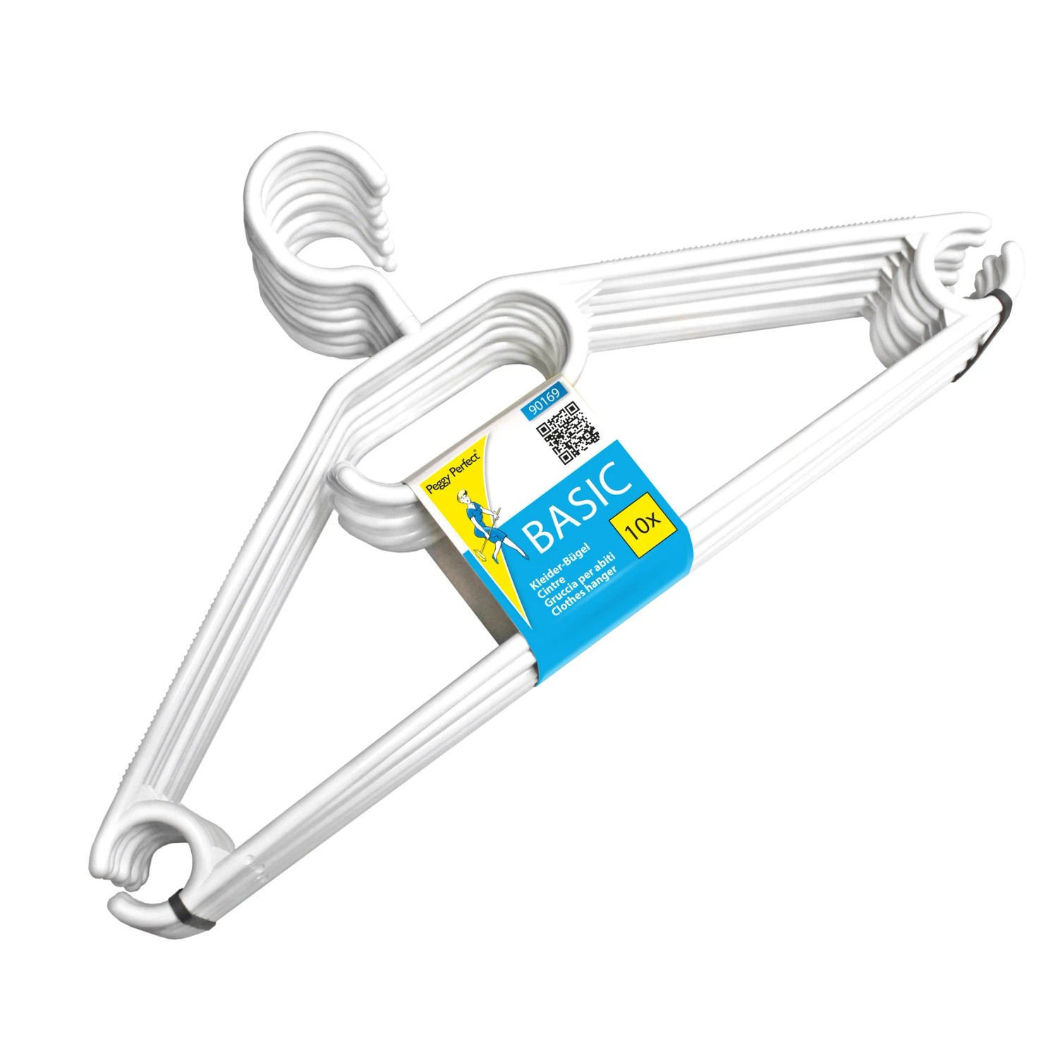 Műanyag vállfa, standard 10 darabos csomag, fehér és fekete színben, 38 x 21 x 7 cm.