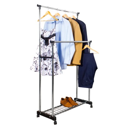 Praktikus guruló ruhaállvány, mely értékes helyet takarít meg az előszobában,gardróbban, vagy a hálószobában. Az állvány magassága könnyedén állítható, 100 és 170 cm között állítható. A talpán található 4 db görgő könnyen mozgathatóvá teszi, melybőlkettőn fékező van, így rögzíthetjük az állványt. Az alján lévő rácsos cipőtartó, cipők, táskák vagy más kisebb tárgyak tárolására alkalmas. Az állvány egyszerűen összeszerelhető, és 15 kg-ig terhelhető.