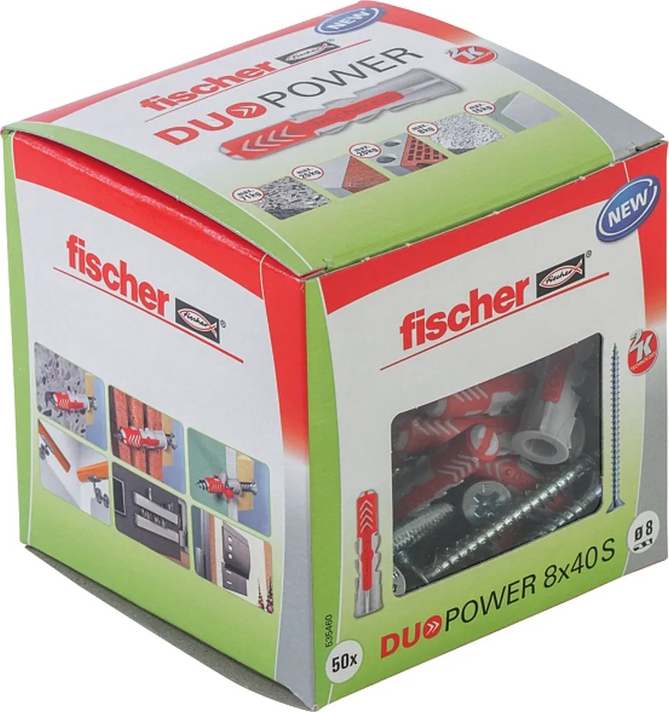 A Fischer Duopower 2 komponensének köszönhetően nagyon jó tartást biztosít. A kiváló minőségű nejlonból készült szürke komponens az építőanyagtól függően automatikusan aktiválja a legjobb tartáshoz szükséges működési elvet (terpesztés, szétnyitás). A piros komponens táguló szárnyai elősegítik a biztos terpesztést, és további biztonságot nyújtanak a szürke komponens mellett. Végül a csavar egyszerű behajtása és megfelelő meghúzása következik. A csavar nem húzható túl. A dübel fejénél kialakított perem megakadályozza, hogy a dübel becsússzon a furatba. A Duopower a legjobb választás, ha például könnyű falipolcok, könnyű tükrös szekrények, függönysínek, virágtartók, elektromos szerelvények és faliórák rögzítésére kerül sor.