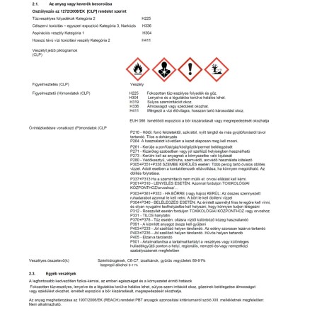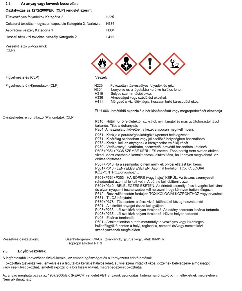 Könnyűbenzinből, ketonból és tisztítást fokozó adalékokból álló, különböző tisztítási munkálatokhoz alkalmazható folttisztító. Ideális bőr- és textília felületek, olajos alkatrészek tisztítására, illetve egyéb háztartási célokra is. Kis mennyiségben való felhordással már eredményesen távolíthatóak el a különböző szennyeződések. Alkalmazásakor védőkesztyű használata ajánlott.