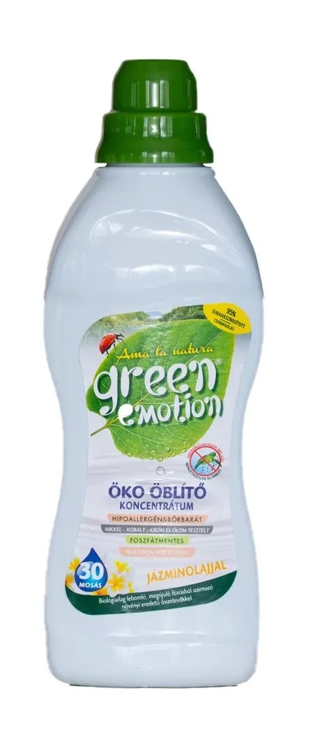 Green emotion Öko öblítőkoncentrátum jázminolajjal 750 ml. Az Öko öblítő koncentrátum kizárólag természetes összetevőt tartalmaz, hipoallergén, növényi összetevőkből készül, nikkel-, kobalt-, ólom- és króm tesztelt, újrahasznosított csomagolás, foszfátmentes, állatokon nem tesztelt, mikroműanyag mentes. Újrahasznosítható energiaforrásokkal készül. 95%-ban újrahasznosított műanyag flakon. Összetevők: 5-15% kationos felületaktív anyag, parfüm. Puhává és illatossá teszi a ruhákat, 30 mosásra elegendő, jázmin illatú.