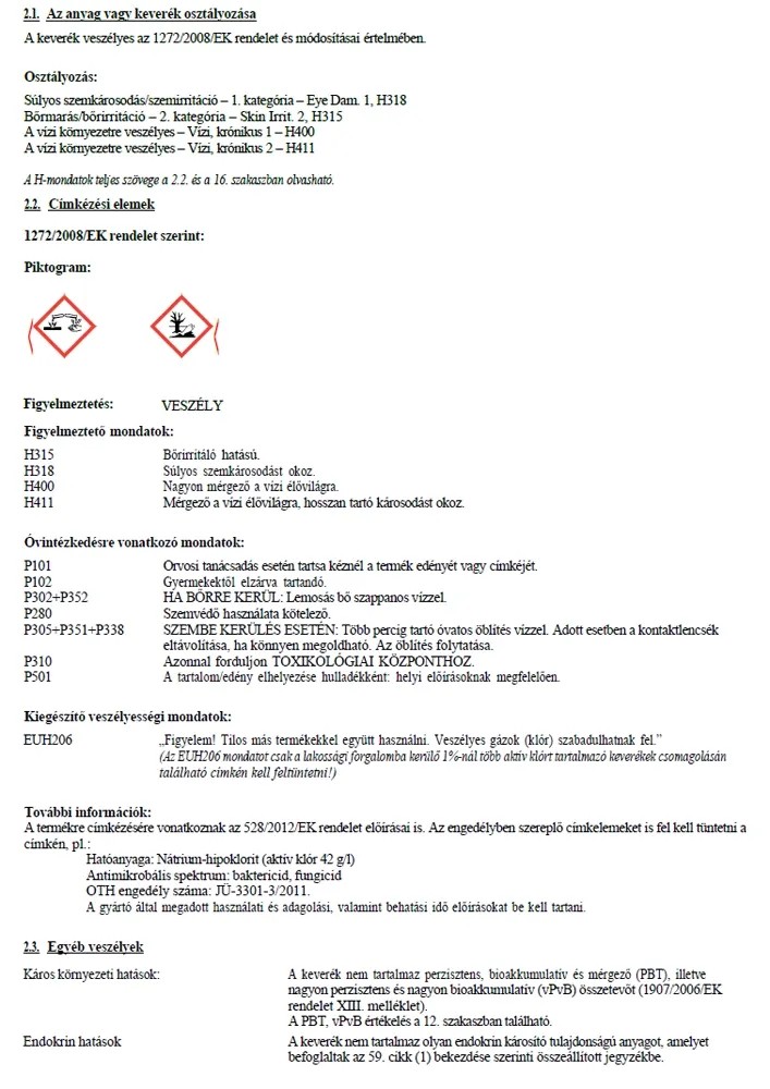 Víz és klórálló padló- és faburkolatok, berendezések, tárgyak felületeinek fertőtelnítésére, valamint textíliák fehérítésére alklamazható.