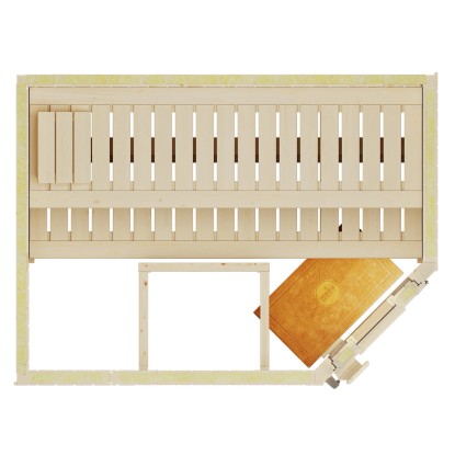 A szaunaház 45 mm vastag, természetes lucfenyőből készült, előregyártott falelemekből áll, amelyek kellemes klímát és hosszú élettartamot biztosítanak.