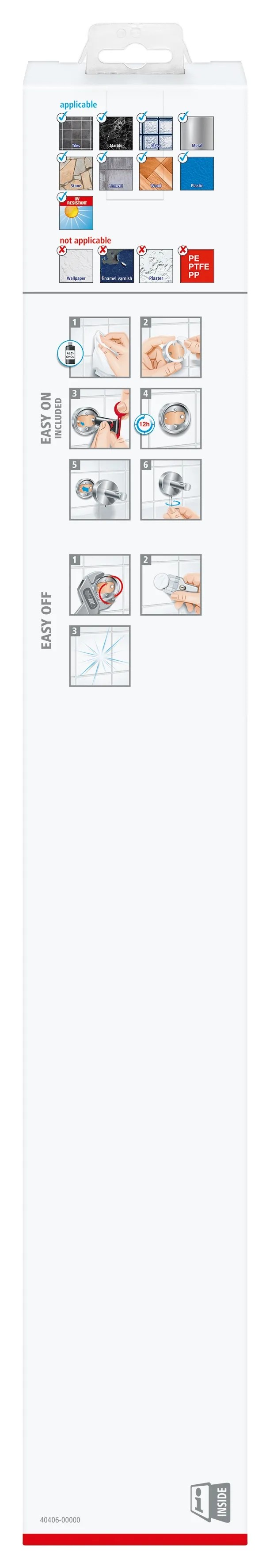 A termék egyszerűen és tisztán, fúrás vagy csavarozás nélkül rögzíthető a falra. Miután felhelyezte a rögzítőadaptert, és feltöltötte a csomagban található ragasztóval, várjon 12 órát, majd biztonságosan rögzítheti a terméket. A mellékelt rögzítőkészlet tartalmaz egy rögzítőadaptert, a ragasztómasszát, valamint egy imbuszt a rögzítéshez. A termék csempére, fémre, terméskőre, márványra, üvegre, fára és számos műanyagra rögzíthető. Akár 12 kg-os tartóereje ellenére bármikor eltávolíthatja, és egy új adapterrel (BK20-2) újra felhasználhatja.