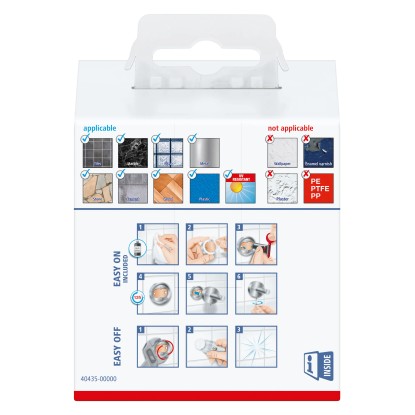 A termék egyszerűen és tisztán rögzíthető a falhoz fúrás vagy csavarozás nélkül. Miután felhelyezte a rögzítőadaptert, és feltöltötte a csomagban található ragasztóval, várjon 12 órát, hogy a terméket biztonságosan és tartósan rögzíthesse. A mellékelt rögzítőkészlet tartalmaz egy rögzítő adaptert, a ragasztómasszát és egy imbuszkulcsot a rögzítéshez. A termék alkalmas csempére, fémre, terméskőre, márványra, üvegre, fára és számos műanyagra való rögzítésre. Az akár 6 kg-os tartóereje ellenére bármikor újra gyorsan és nyom nélkül leszedheti, és egy új BK20 adapterrel újra fel is szerelheti egy másik helyre.