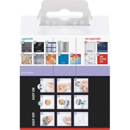 Egyszerű, fúrás nélküli felszerelés, nem igényel barkácsismereteket. Az akasztó nyom nélkül eltávolítható és könnyedén újrafelhasználható. Ehhez egyszerűen vásárolja meg külön a hozzá tartozó BK73 adaptert, és ugyanígy rögzítse újra.