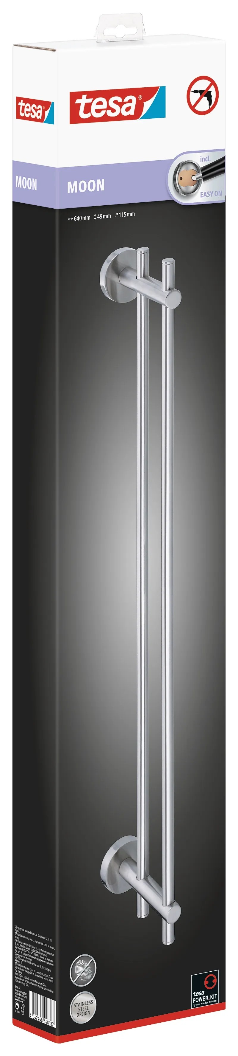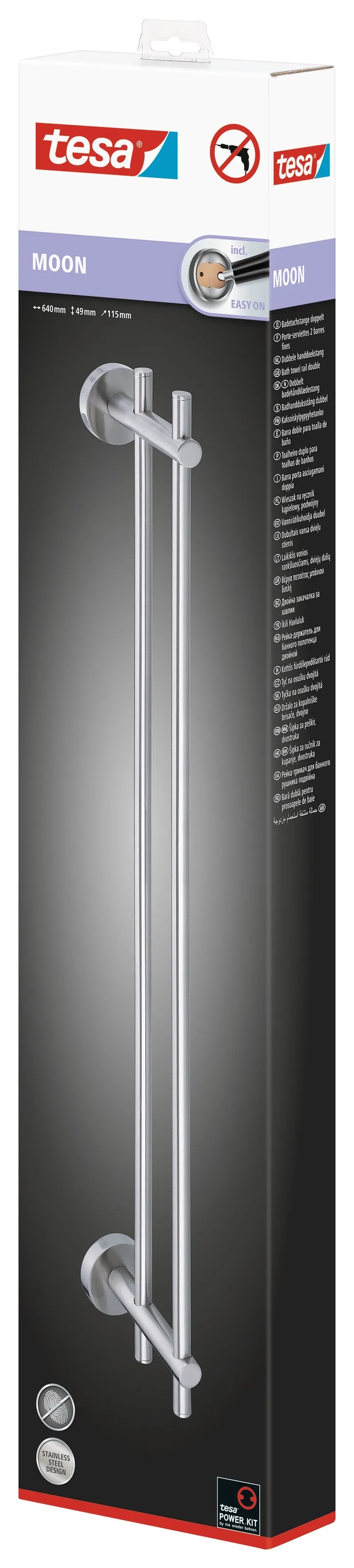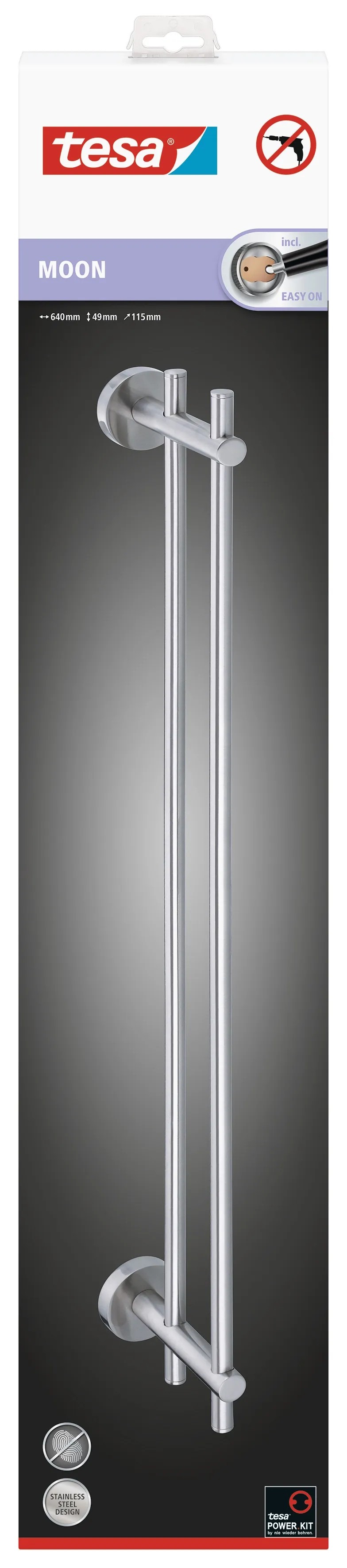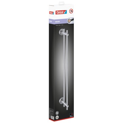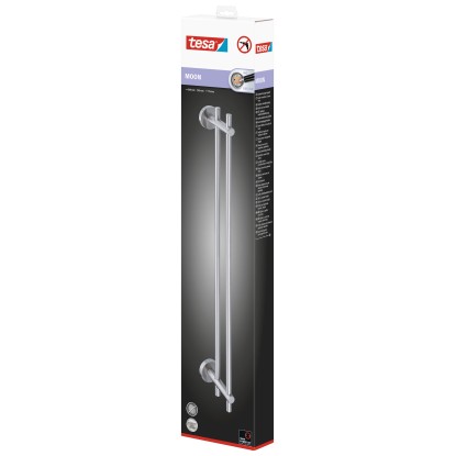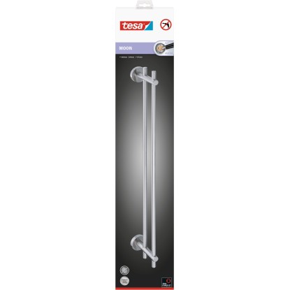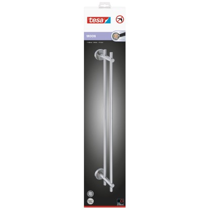 A Tesa Moon törölközőtartó rozsdamentes acél megjelenésű, modern kialakításával ügyesen illeszkedik minden fürdőszobába. A törölközőtartó rúd két nagyméretű zuhany- és fürdőlepedőnek kínál helyet, amelyek zuhanyzás vagy fürdés után közvetlenül kéznél vannak.
