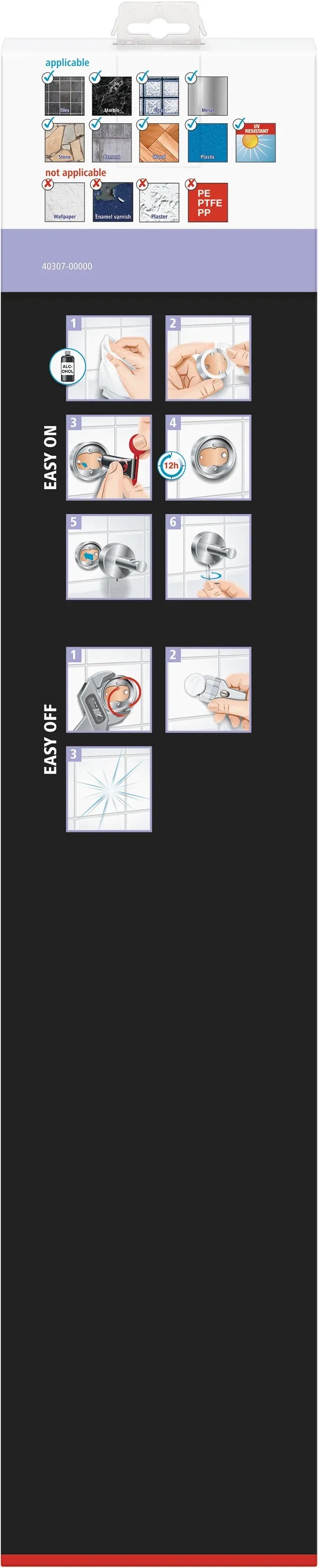 A ragasztható törölközőtartó nem alkalmas vakolatra, tapétára, faltextíliára és műanyagokra, például PP, PE és PTFE-re való felszerelésre.