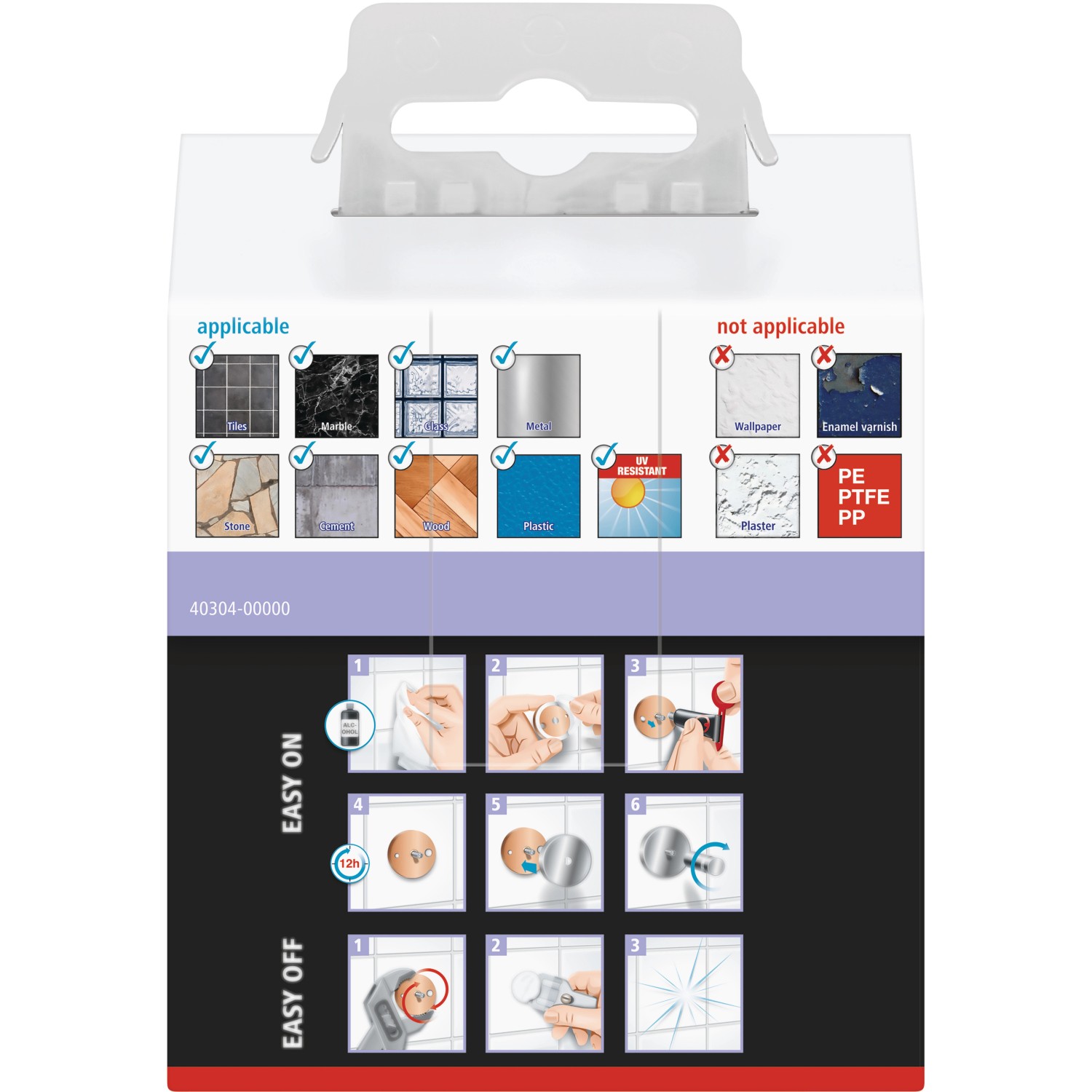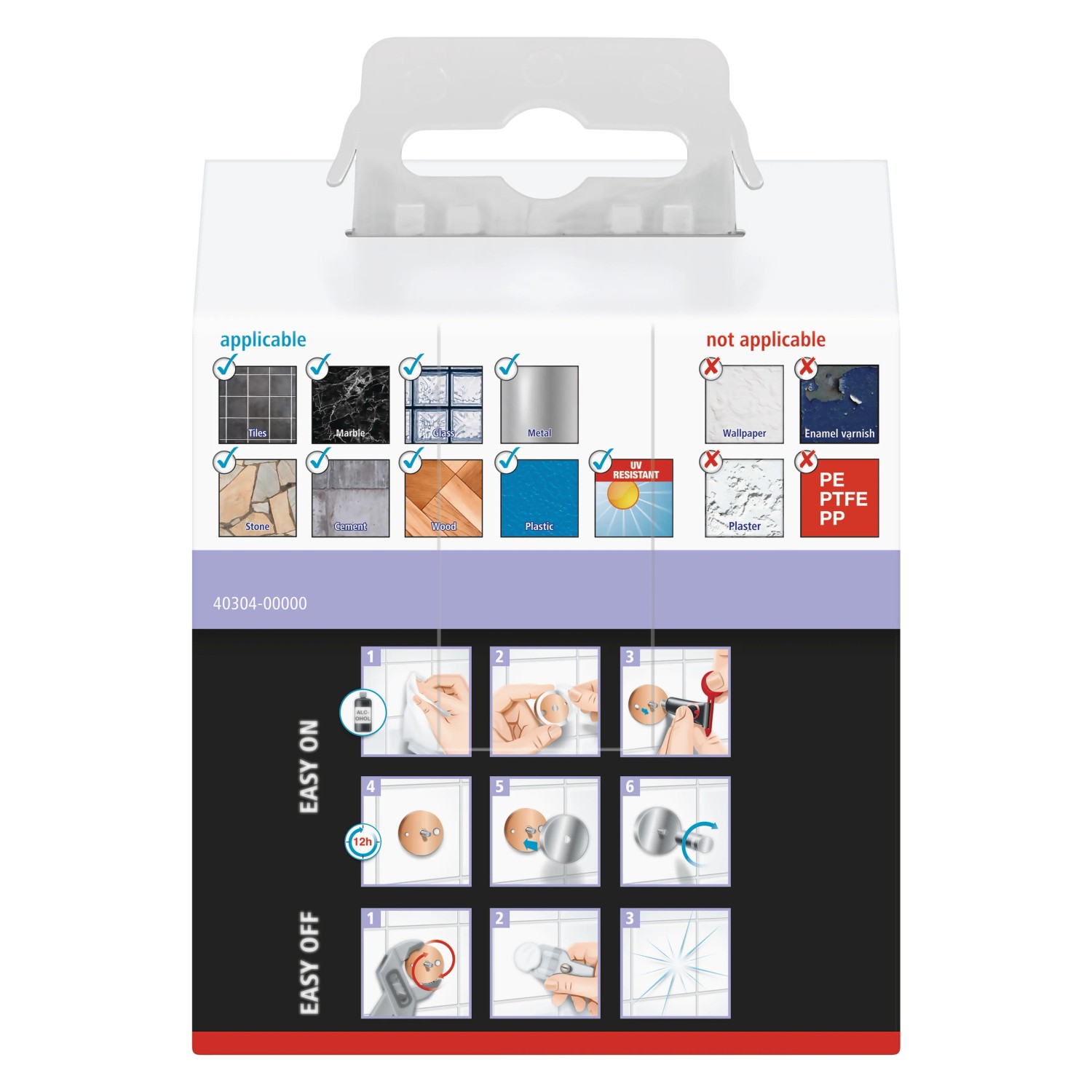 A praktikus ragasztásos rögzítéssel a törölköző akasztót fúrás vagy csavarozás nélkül felszerelheti. Az öntapadós adaptert a falra kell nyomni, majd a ragasztómasszát betölteni. 12 óra száradási idő után az akasztó már rácsavarozható az adapterre. Ez a rögzítési technológia tartós és megbízható tartást biztosít 6 kg-ig. Ezenkívül a törölköző akasztó egy új adapterrel (BK37) újrafelhasználható, mivel maradék nélkül eltávolítható.