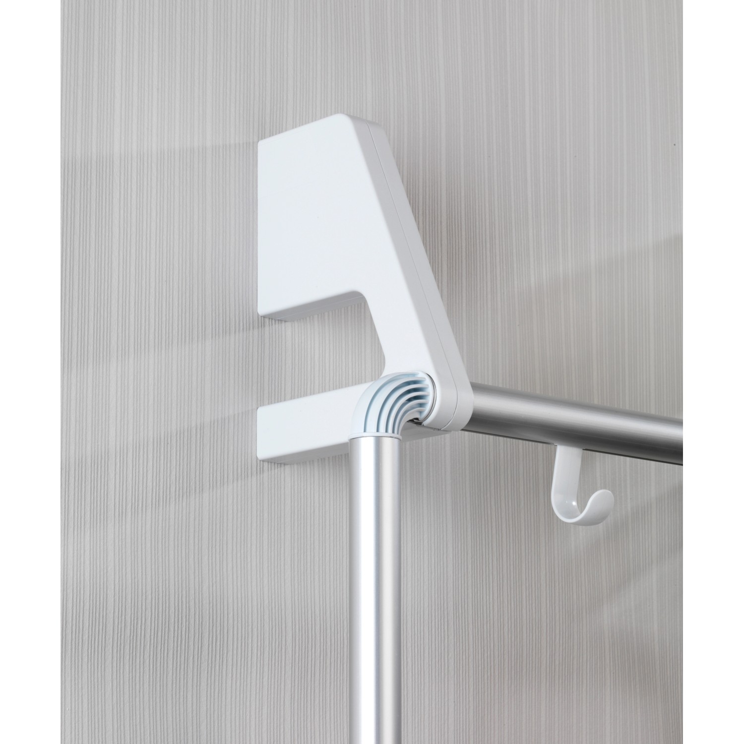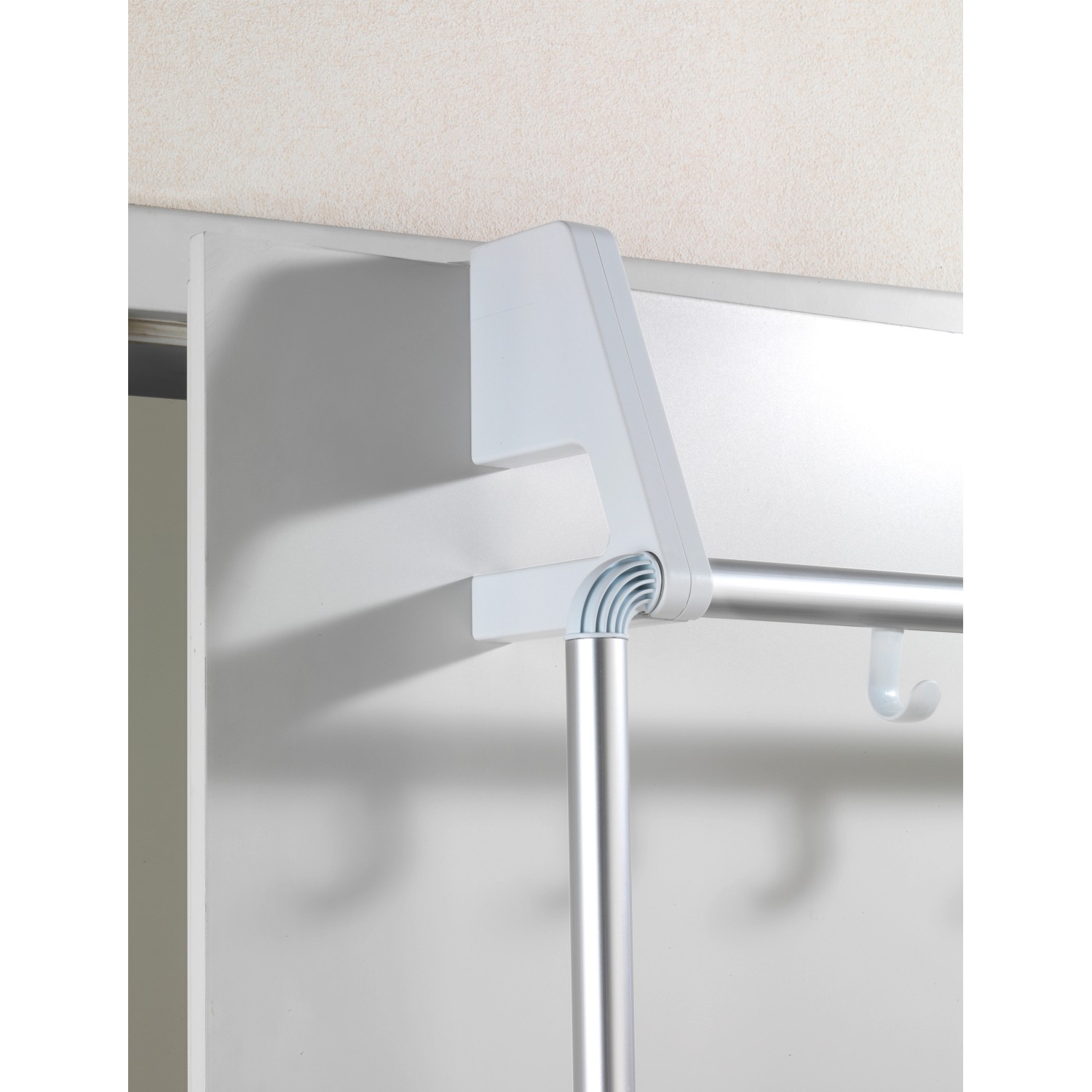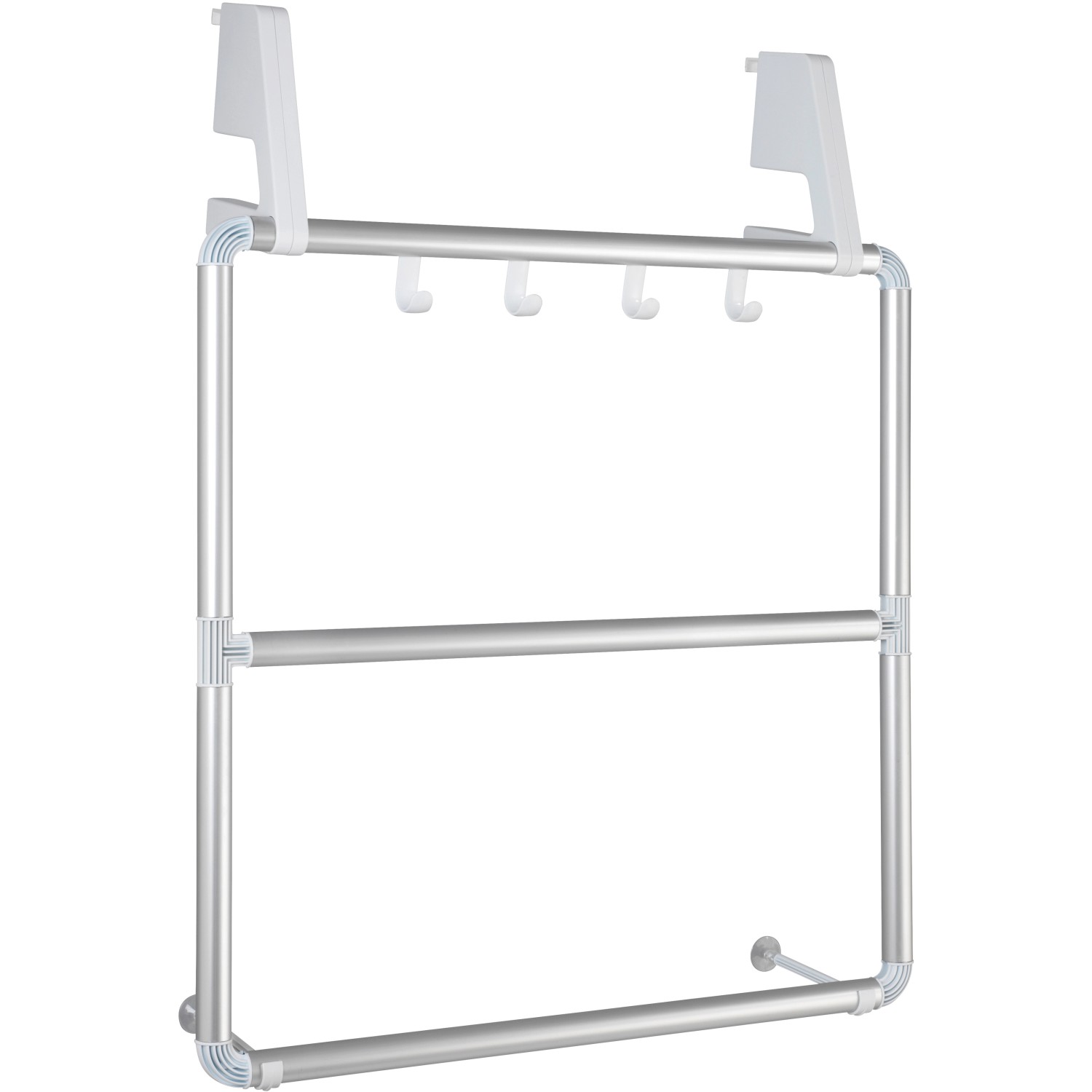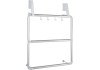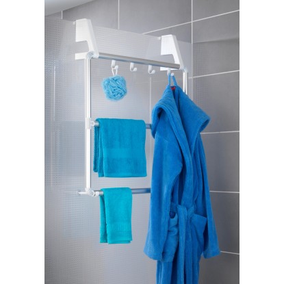 3 tartórúdon törölközők és ruhadarabok helyezhetők el, a 4 beépített akasztón pedig mosdókesztyűk és fürdőszobai kiegészítők számára van hely. A tartót egyszerűen az ajtóra kell akasztani. Az akasztórész minden elterjedt ajtószélességhez megfelelő, és a falra történő rögzítéshez is használható. Az ajtók a belógatott törölközőtartó ellenére továbbra is probléma nélkül zárhatók.