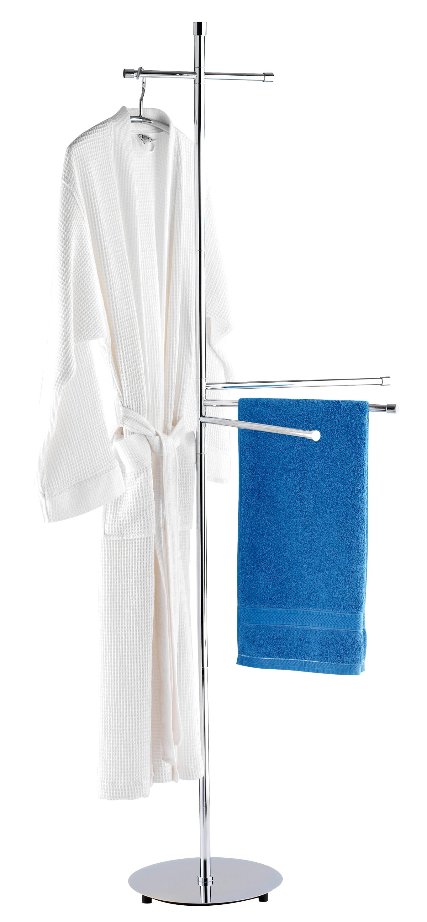 3 mozgatható karjával sok helyet kínál a törülközők és ruhadarabok számára. A kiegészítő ruhaakasztó rúdon kabátok, ruhák és fürdőköpenyek is elhelyezhetők. A minőségi, nehéz talplemez stabil tartást biztosít a szabadonálló ruhaállványnak.