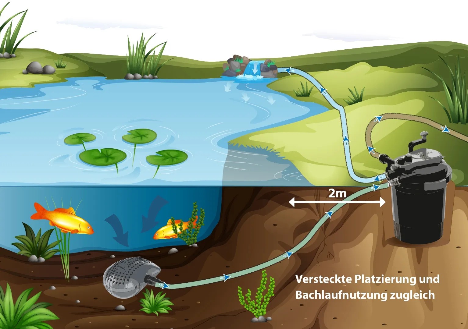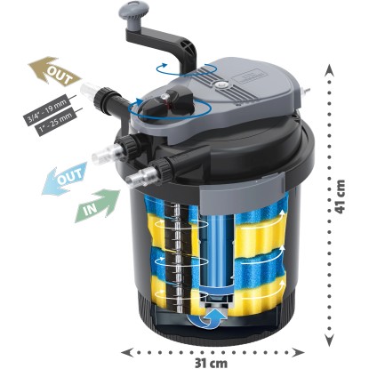 A Heissner külső szűrő ideális az összes, max. 4000 l űrtartalmű kerti tóhoz. Használata rendkívül egyszerű, ideális kezdő tóépítők számára is. A szett teljes, tartalmazza a szivattyút, a vízcsövet, illetve a többi kiegészítőt is. Használata alatt ajánlott a tavi élőlények ideiglenes eltávolítása. A beépített UVC-szűrő hatékonyan szünteti meg a víz zavarosságát.
