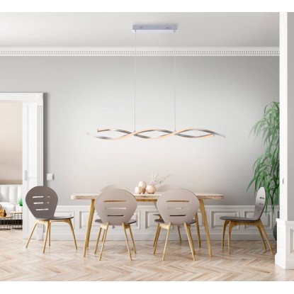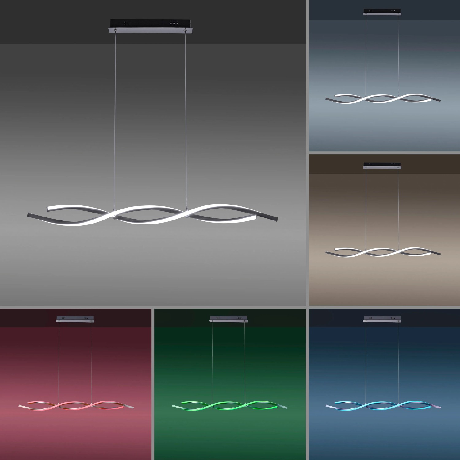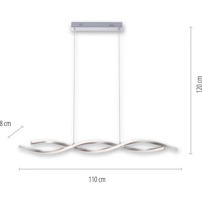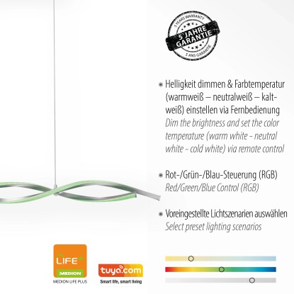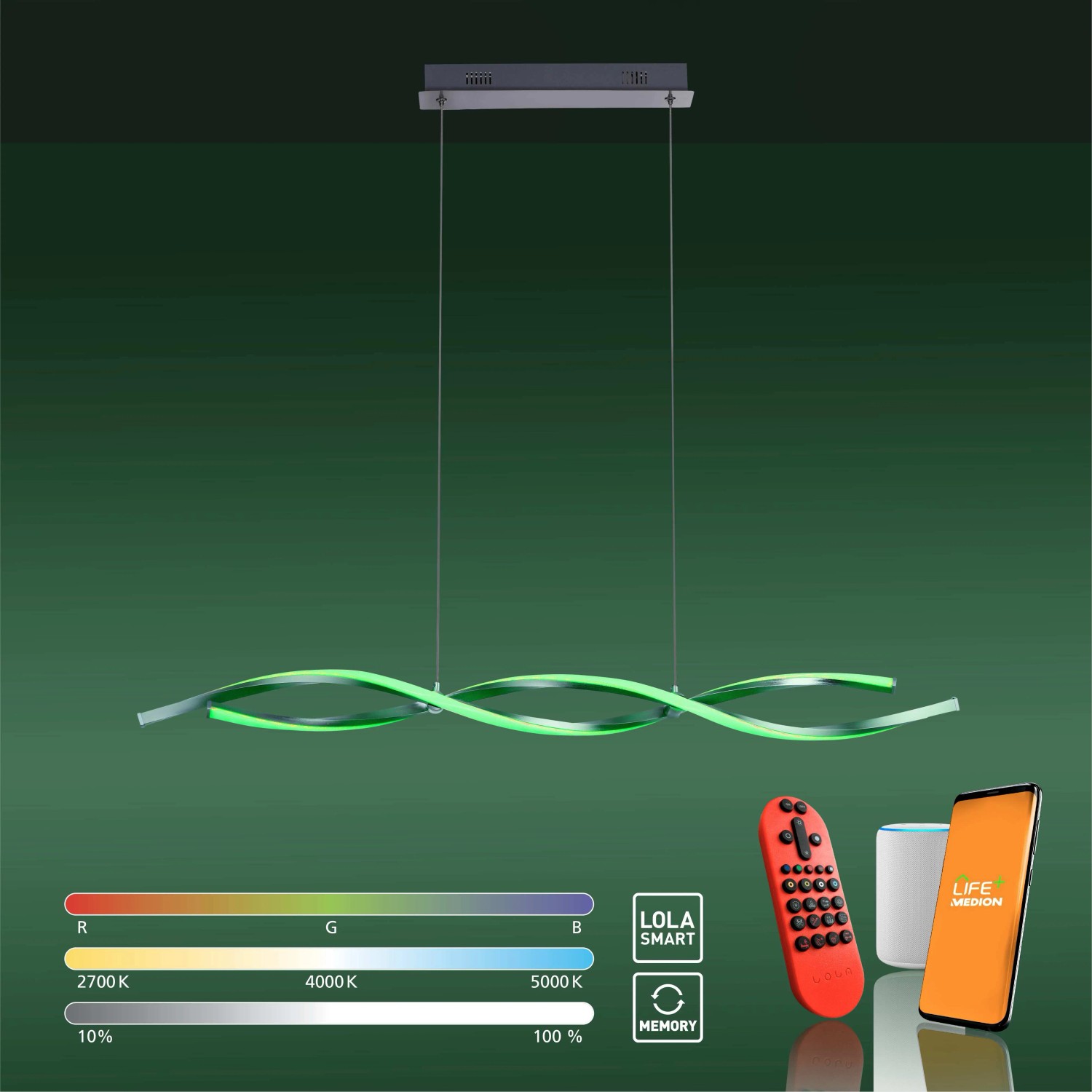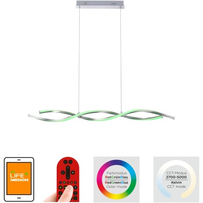 A LOLAsmart-Swing LED-es függőlámpa csodálatos szemet gyönyörködtető látvány otthonában: A függőlámpa modern megjelenésével és divatos hullámos kialakításával nyűgöz le. Az ívelt mennyezeti lámpához LOLA infravörös távirányító tartozik, amely azonnal használatra kész. Így egyénileg szabályozhatja a fény színhőmérsékletét a melegfehértől (2700 Kelvin) a nappali fehérig (5000 Kelvin), és szimulálhatja a nap folyamán előforduló fényszíneket. A nappali fényszabályozás és a fényerő beállítása mellett az izzót RGB színekbe is kapcsolhatja, így egyes fénymódok, például a kandallóban lobogó tűz vagy naplemente is szimulálhatók. A memória funkció révén elmenti a kívánt beállításokat. Teremtsen ügyesen jó hangulatot a függőlámpával, és hagyja, hogy a modern megjelenés és a lenyűgöző világítási élmény elvarázsolja! A lámpa okosotthon-kompatibilis, így még nagyobb sokoldalúságot kínál. A megfelelő alkalmazással (MEDION LIFE+) az összes funkció tabletről vagy okostelefonról is működtethető, vagy hangasszisztenssel, pl. Amazon Alexa vagy Google Home, amelyen keresztül a beállítások egyszerűen, hangparancsokkal módosíthatók. A függőlámpa hossza 110 cm, szélessége 8 cm és felfüggesztése 120 cm.