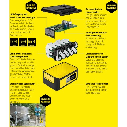 A csereakkumulátor a legmodernebb lítiumion-technológiával készült, ezért különösen robusztus és könnyen karbantartható. A lítiumion-celláknak köszönhetően az akkumulátor tartósan nagy teljesítményt nyújt. Az akkumulátor fűtő pufferrel és intelligens akkumulátorkezeléssel rendelkezik. Ez a kombináció a legjobb teljesítményt nyújtja a Kärcher kerti szerszámokkal vagy magasnyomású mosókkal végzett kerti munkák során.Kimagasló kényelem és hosszú élettartam
