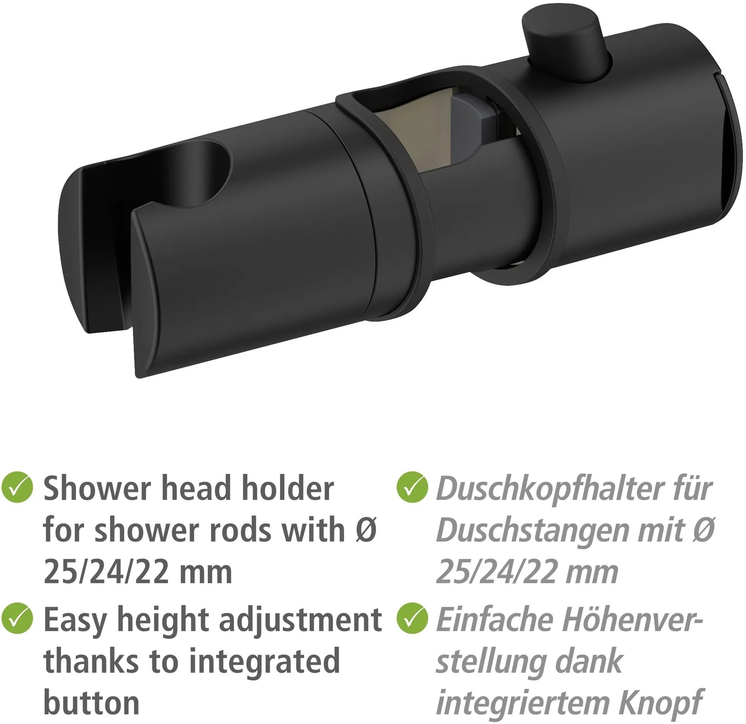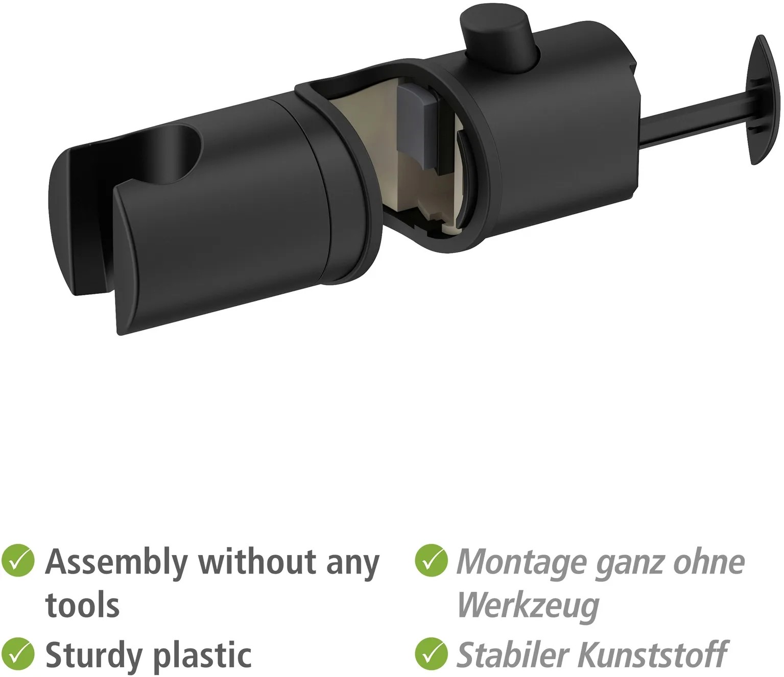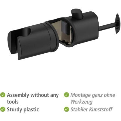 Aki szeretné kicserélni zuhanytartóját, akkor a Wenko Libertà fekete zuhanytartót válassza. A praktikus tartó felszerelése szerszámok nélkül is elvégezhető. A kézi zuhanyok felakasztására szolgáló tartó stabil műanyagból (ABS) készült, és 24 és 25 mm átmérőjű zuhanyrudakhoz alkalmas. A zuhanytartó a mellékelt szerelőkészlettel 22 átmérőjű rudakhoz is könnyen beállítható. A csúsztatható zuhanytartónak a rúdra történő rögzítéséhez nem szükséges szerszám. Ezenkívül a zuhanyrudat nem kell fáradságosan leszerelni, hanem a helyén marad. A felhelyezés után a tartó magassága a beépített gombbal könnyen állítható, így Ön bármikor pihentető zuhanyzásban részesülhet.