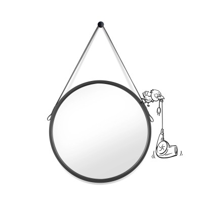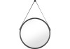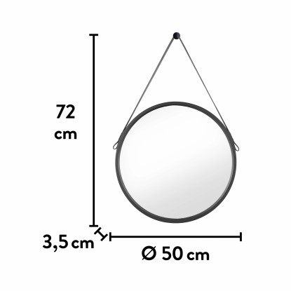 A fekete színű, bőrhatású PU szalaggal díszített, kerek tükör modern hangulatot kölcsönöz a fürdőszobának. A tükör nem párásodik, mérete 50 cm x 50 cm x 3,5 cm.