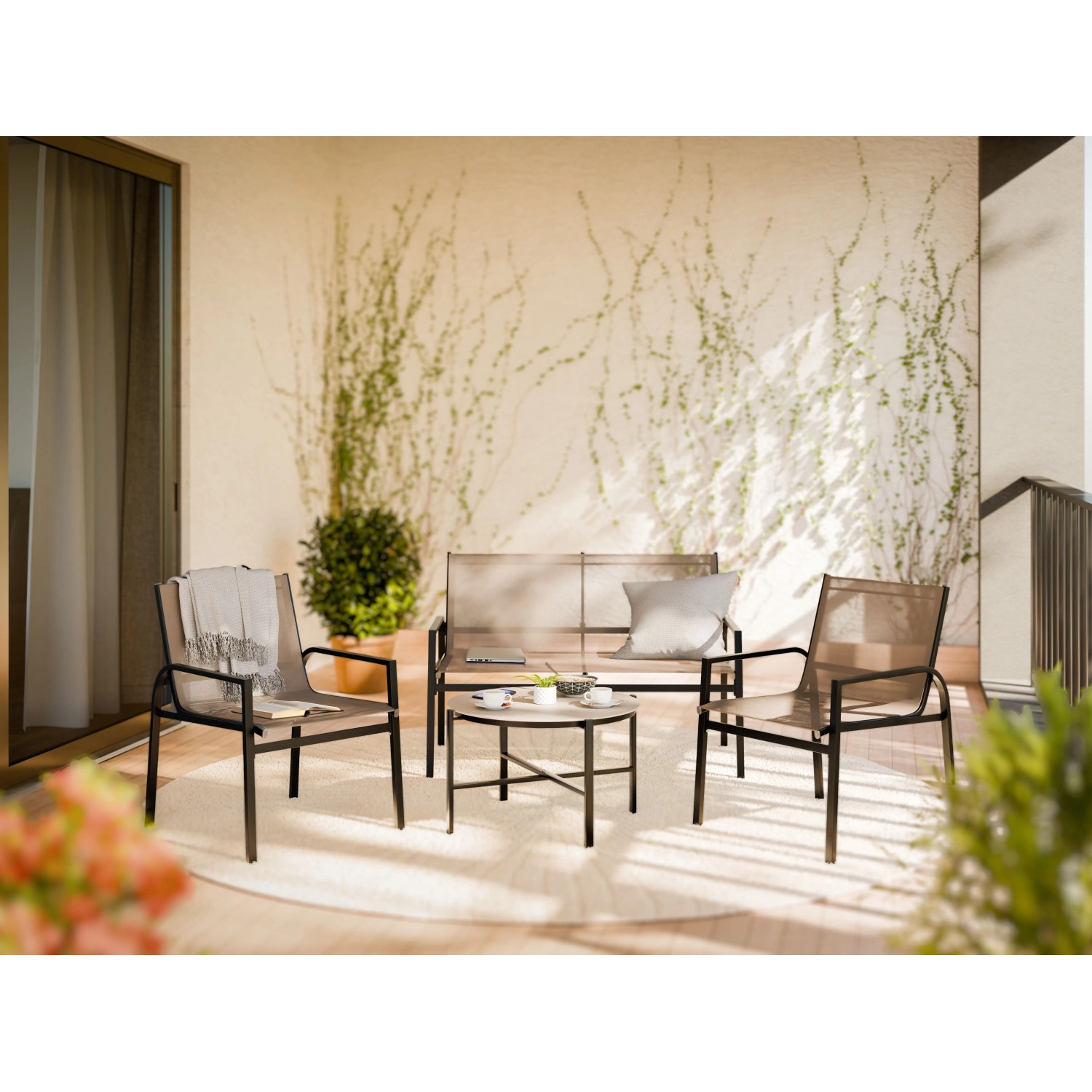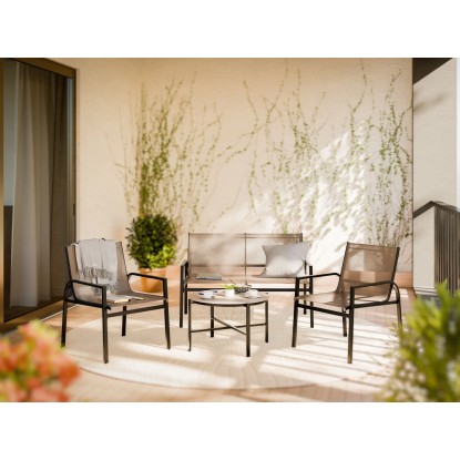 Dobja fel kültéri területét a modern Tapena kertibútor-garnitúrával! A 4 részes garnitúra a színek és anyagok elegáns összjátékával hódít: A porszórt bevonatú, masszív, fekete színű acélváz stílusos kontrasztot alkot a tópszínű textilénhuzattal. A kinézetet az asztal teszi teljessé, melynek üveglapja szintén tópszínt kapott. Így Ön pillanatok alatt harmonikus hangulatot teremthet a teraszon vagy az erkélyen.