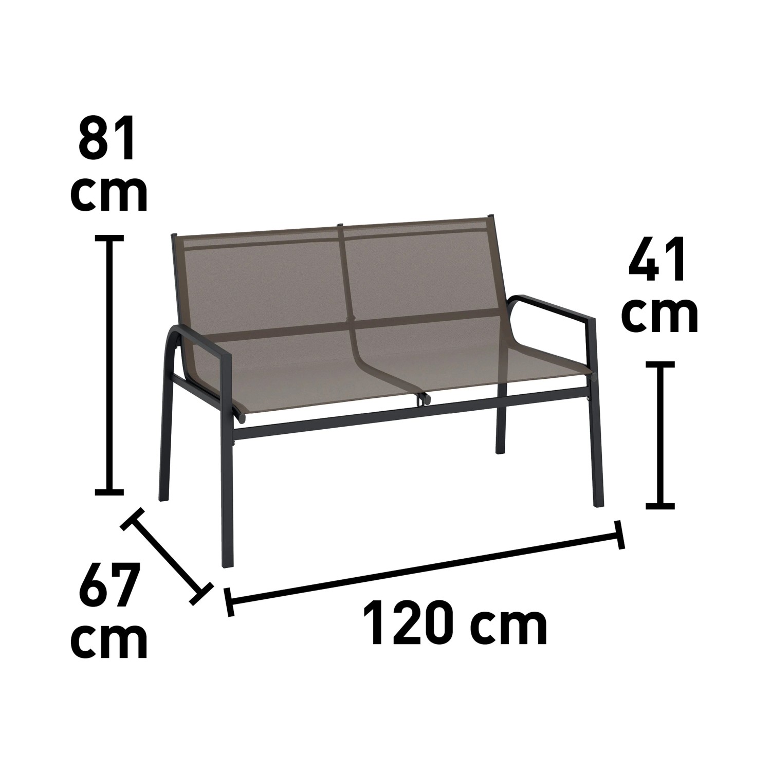 1 db kétszemélyes kanapé 81 cm x 120 cm x 67 cm (Ma x Sz x Mé), ülésmagasság 41 cm, teherbírás max. 220 kg