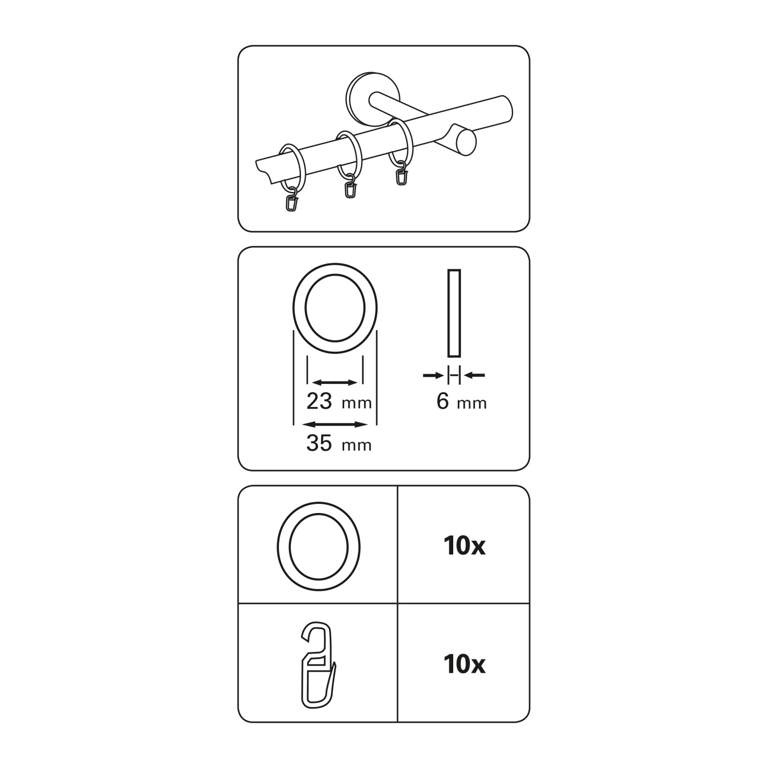 A ráncszedő akasztóval rendelkező Gardinia függönykarikák segítségével a függöny könnyedén rögzíthető a vitrázs és kávéházi rudakra. A függönykarikák műanyagból készülnek, és különböző színekben kaphatók.