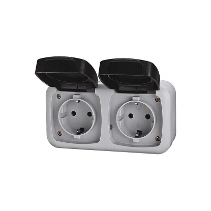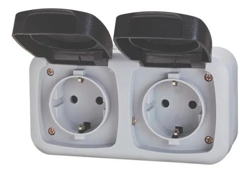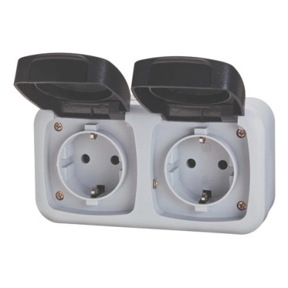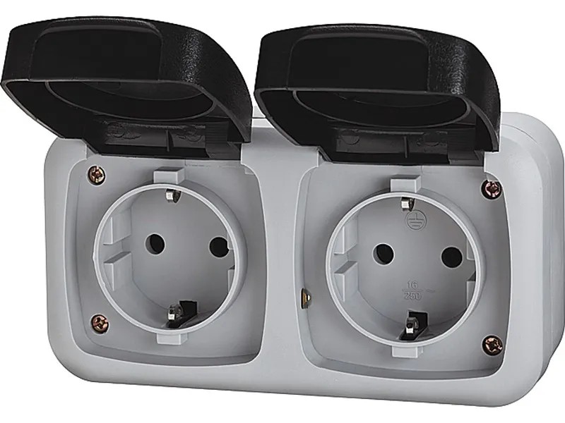 A szürke, nedves helyiségekben használható csatlakozóaljzat pincékben, garázsokban vagy fedett kültéri területeken, falon kívüli szereléshez alkalmas. Nagy csatlakozótérrel rendelkezik, amelynek burkolata speciális műanyagból készült. A lehajtható fedél modern és funkcionális megjelenéssel bír, és megvédi a 2 részes csatlakozóaljzatot az IP44 szabvány szerinti fröccsenő víztől. Névleges feszültsége 230 V, névleges áramerőssége 16 A.
