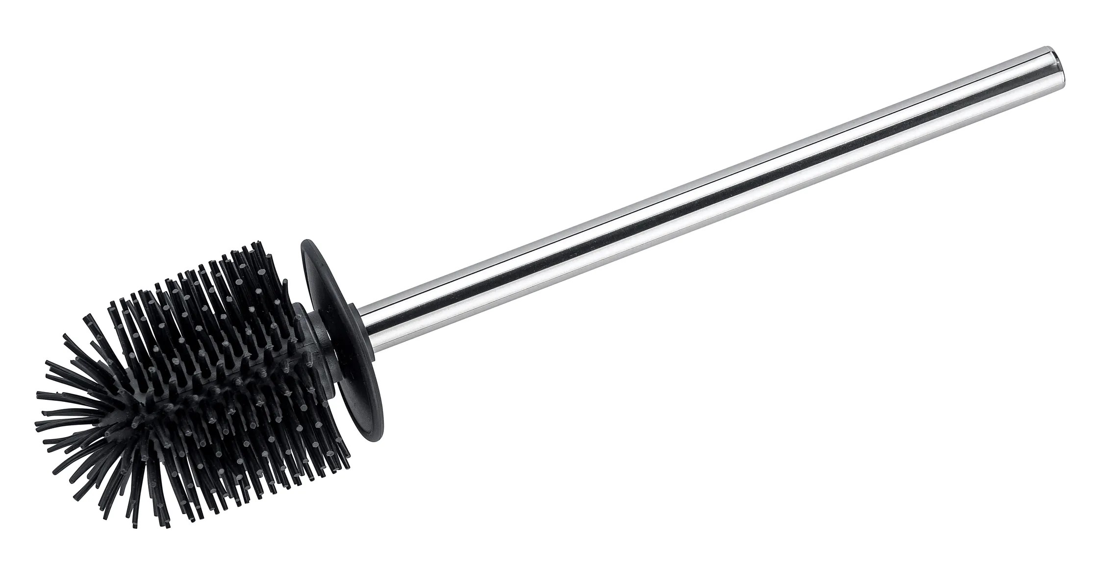 Ez a WC kefe a WC-készlet ideális cserekeféje. A kiváló minőségű fekete kefefej szilikonból készül. A speciális tapadásgátló hatás gondoskodik arról, hogy a makacs maradványok és WC-papír ne ragadhasson a kefébe, hanem az öblítés egyszerűen lemossa őket. Így ez az okos kefe mindig higiénikus és tiszta marad, önmagát tisztítja. Ezzel a praktikus WC-kefével alaposan megtisztítható a WC. Strapabíró és ruga lmas sörtéi révén megbízhatóan használható. A nyél fényes rozsdamentes acélból készült. Ezenkívül a hatékony, fekete, 7,5 cm átmérőjű kefefej cserélhető. A beépített műanyag fedél véd a bepillantástól, ha nyitott WC-készlettel használják.