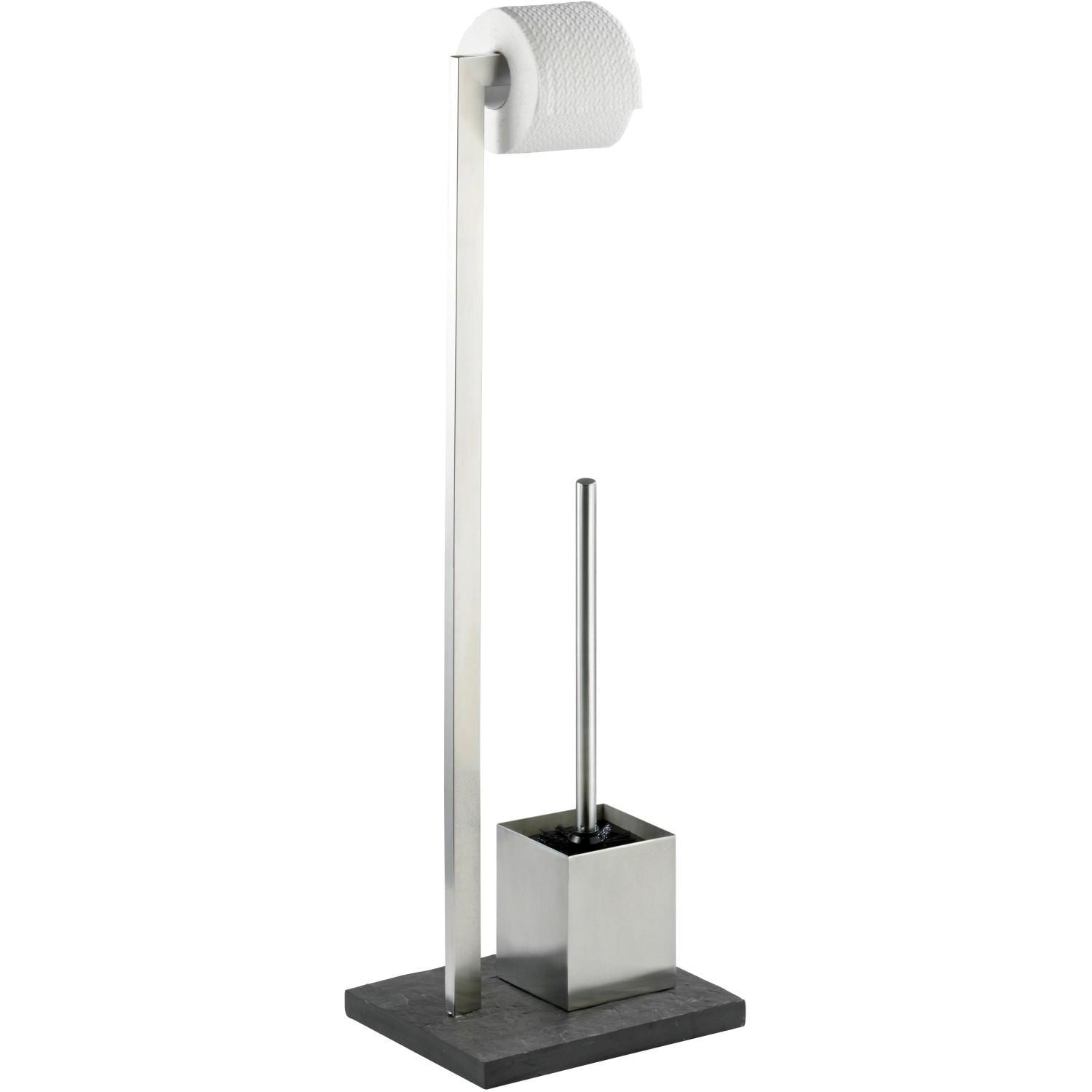 Együtt az ellentétek: egyenes vonalak és érdes terméskő hatás jellemzik a Slate Rock fürdőszobai sorozatot. A minőségi nemesacél és pala hatású polirezin alkalmazásának köszönhetően a sorozat elemei elegáns, természetes megjelenésűek. A rozsdamentes acél álló WC kefe egy 2 az 1-ben kombináció, amely egy krómozott műanyagból készült, nyitott WC kefetartóval, valamint a tekercs azonnali kivételét lehetővé tevő WC-papírtartóval rendelkezik. Tömör, négyszögletes talpa stabilitásról gondoskodik. A garnitúrához tartozó WC kefe 7,5 cm átmérőjű, cserélhető, fekete kefefejjel és rozsdamentes acél nyéllel rendelkezik.