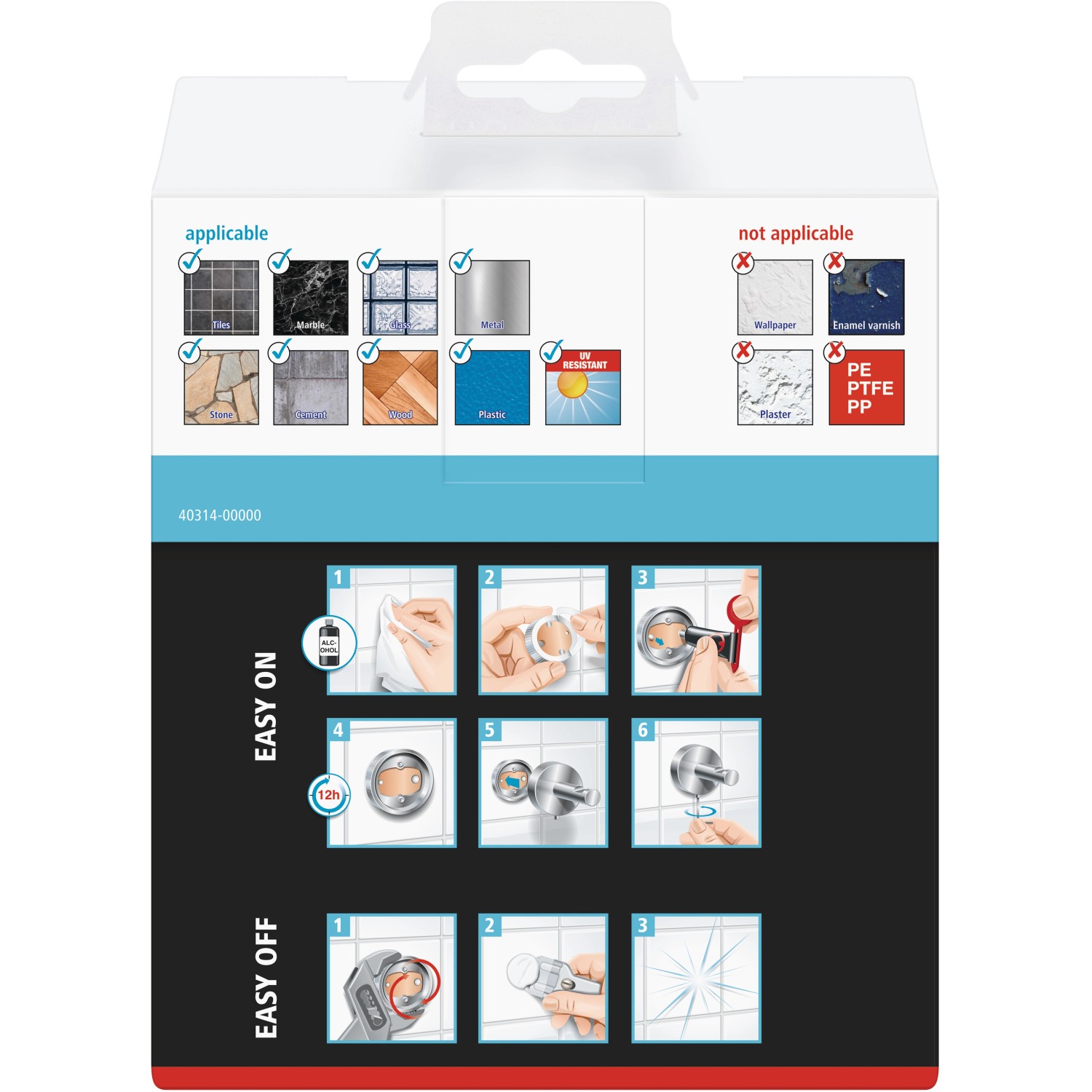 A WC-papír tartó könnyen és tisztán rögzíthető a falhoz fúrás vagy csavarozás nélkül. A rögzítő adapterrel és a ragasztómasszával biztonságos és időtálló tartás érhető el 6 kg-ig. A WC-papír tartót bármikor eltávolíthatja, és egy új adapterrel (BK20) akár újra is használhatja. Csempéi mindeközben végig sértetlenek maradnak.