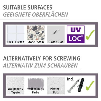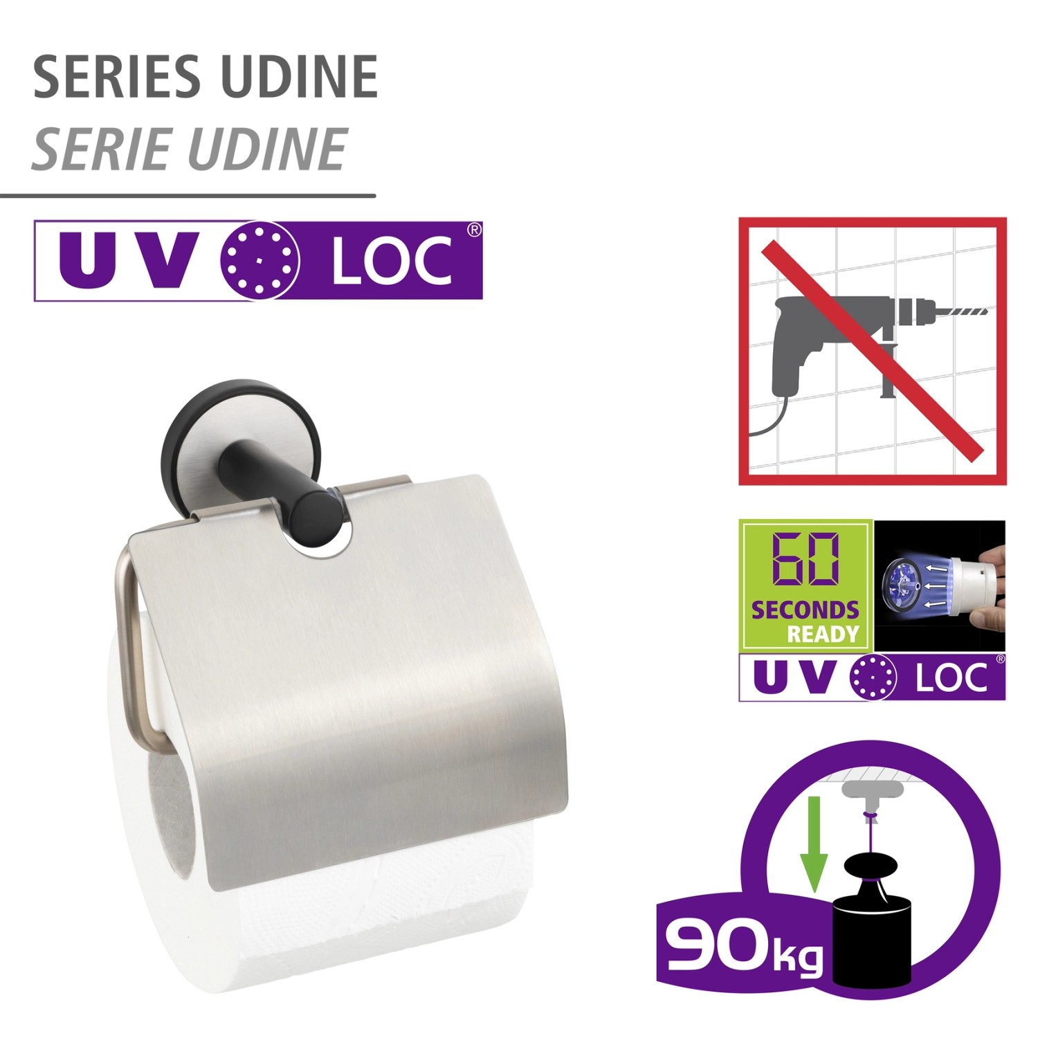 Az Udine fedéllel ellátott UV-Loc WC-papír tartó hasznos elemmel egészíti ki fürdőszobai berendezését, amely fúrás nélkül rögzíthető a falra. A falra szereléshez mellékeljük a tartóhoz a Wenko egyedülálló UV-Loc ragasztórendszerét, amely rendkívül erős tartást biztosít valamennyi teherbíró felületen, például csempén vagy üvegen, valamint teljesen egyszerűen és tisztán, ragasztómaradványok nélkül rögzíthető.