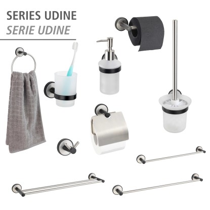 Az UV-Loc Udine fürdőszobai sorozat kiegészítői tiszta hellyé varázsolják a fürdőszobát. A klassz és urban stílusú fürdőszobai segédeszközök csiszolt és matt feketére festett rozsdamentes acél megjelenésűek. Az egy WC-papír tekercshez való praktikus tartó kiváló minőségű rozsdamentes acélból készült, és eleganciát kölcsönöz a fürdőszobának. A WC-papír tartó mérete: 14,5 cm x 12,5 cm x 6,5 cm és vendég WC-ben való használatra is ideális.