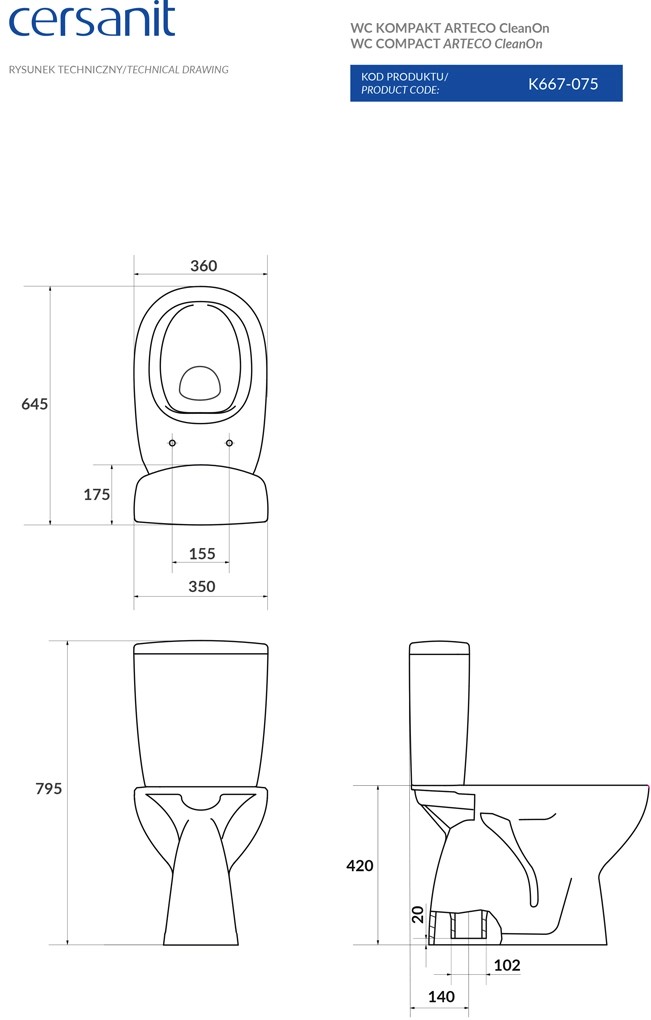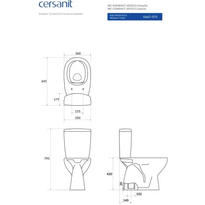 A Cersanit Arteco monoblokkos wc szett klasszikus formavilágú szett, ezért kiválóan illeszkedik sokféle fürdőszoba dizájnhoz. A csomagolás tartalmazza a perem nélküli, alsó kifolyású WC-t, az oldalsó bekötésű kerámia tartályt a szerelvényekkel és a duroplaszt lecsapódásmentes Wc ülőkét. A termék viztakarékos 3/5 l-es leeresztő szeleppel van ellátva. A töltőszelep csatlakozási mérete 3/8''.