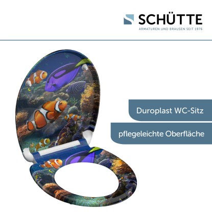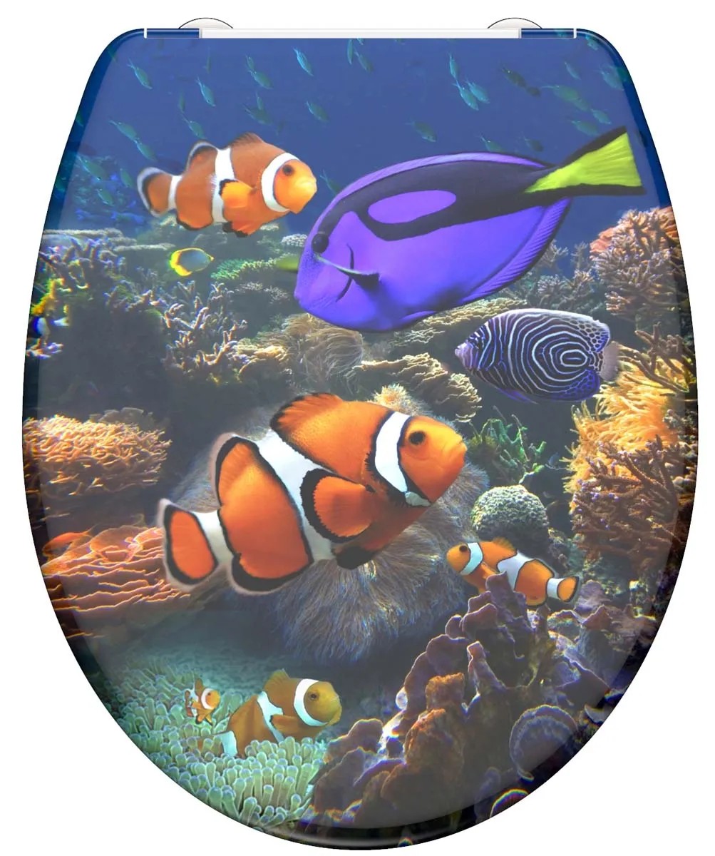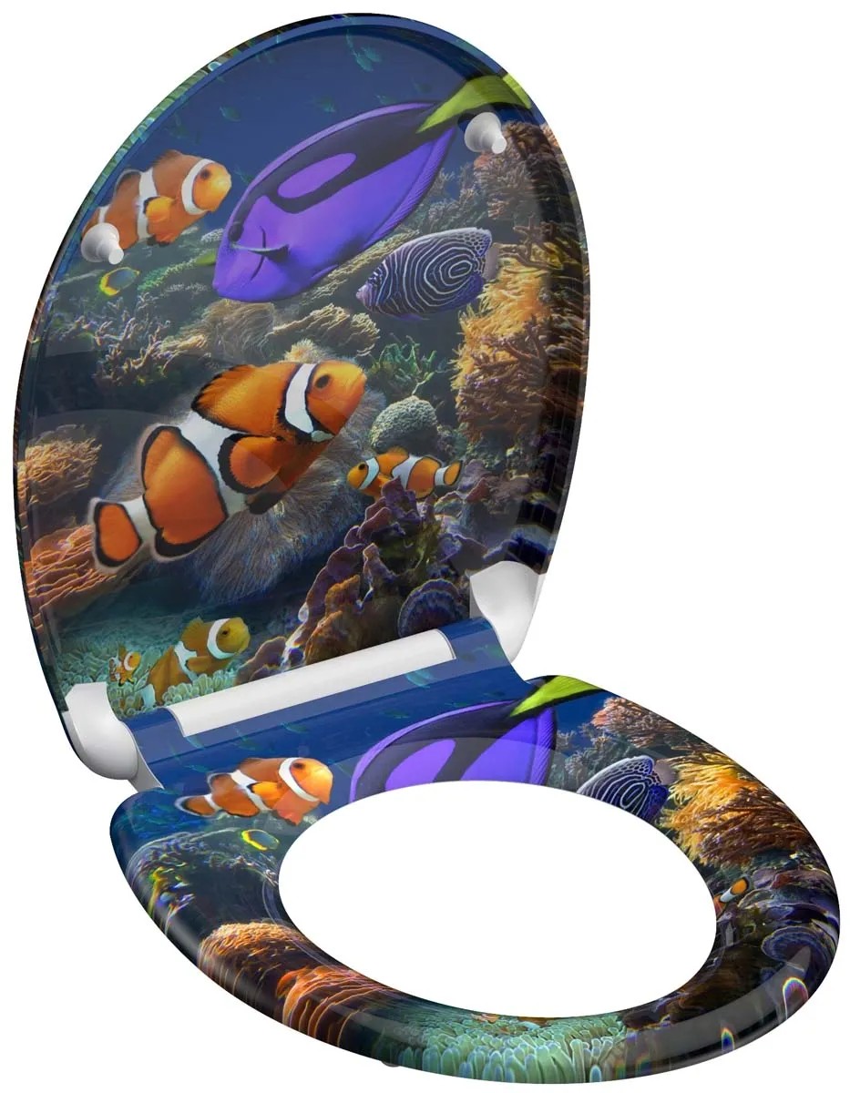 SEA LIFE duroplaszt WC-ülőke. Ötletes formaterv egészen a legutolsó részletig.. Az az elképzelés, amely szerint a fürdőszoba kizárólag a napi higiéniát szolgálja, már rég a múlté.. Az olyan alapértékek, mint a sokszínűség és a termékek minősége, valamint az egyediség új távlatokat nyitnak.. . A termék jellemzői. . Egyedi: tetszetős SEA LIFE nyomott minta. Kényelem és funkcionalitás: Kiváló minőségű WC-ülőke leeresztő automatikával (a fedél és az ülőke lágyan és hangtalanul csukódik le). Praktikus kezelés: a gyorszáras technológiának köszönhetően a WC-ülőke egyszerűen levehető. A WC-ülőke normál méretű, így szinte minden szokványos WC-csészéhez illik. Rugalmasság: állítható rögzítési technológia a különböző módokon történő felszereléshez. Innovatív rögzítési technológia: a ragasztólapos plusz rögzítésnek köszönhetően nem csúszik el a WC-ülőke. Hosszú élettartam: a rendkívül kemény felületű duroplaszt különösen törésbiztos és karcálló. Könnyen ápolható: a duroplaszt WC-ülőkék zárt pórusú felülete egyszerű és higiénikus tisztítást tesz lehetővé. A teljes szerelőkészletnek, valamint a könnyen érhető szerelési útmutatónak köszönhetően gyerekjáték a felszerelés. . Műszaki adatok:. . Mérete (Sz x Ma x Mé): 374 x 450 x 40 mm. A termék súlya: kb. 1657 g. Színe: nyomott minta három felületen. . Minőség-ellenőrzés:. a szigorú minőség-ellenőrzések és a kiváló minőségű anyagok nagy fokú biztonságról és tökéletes minőségről gondoskodnak.
