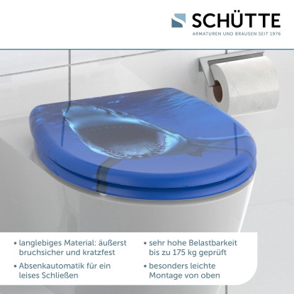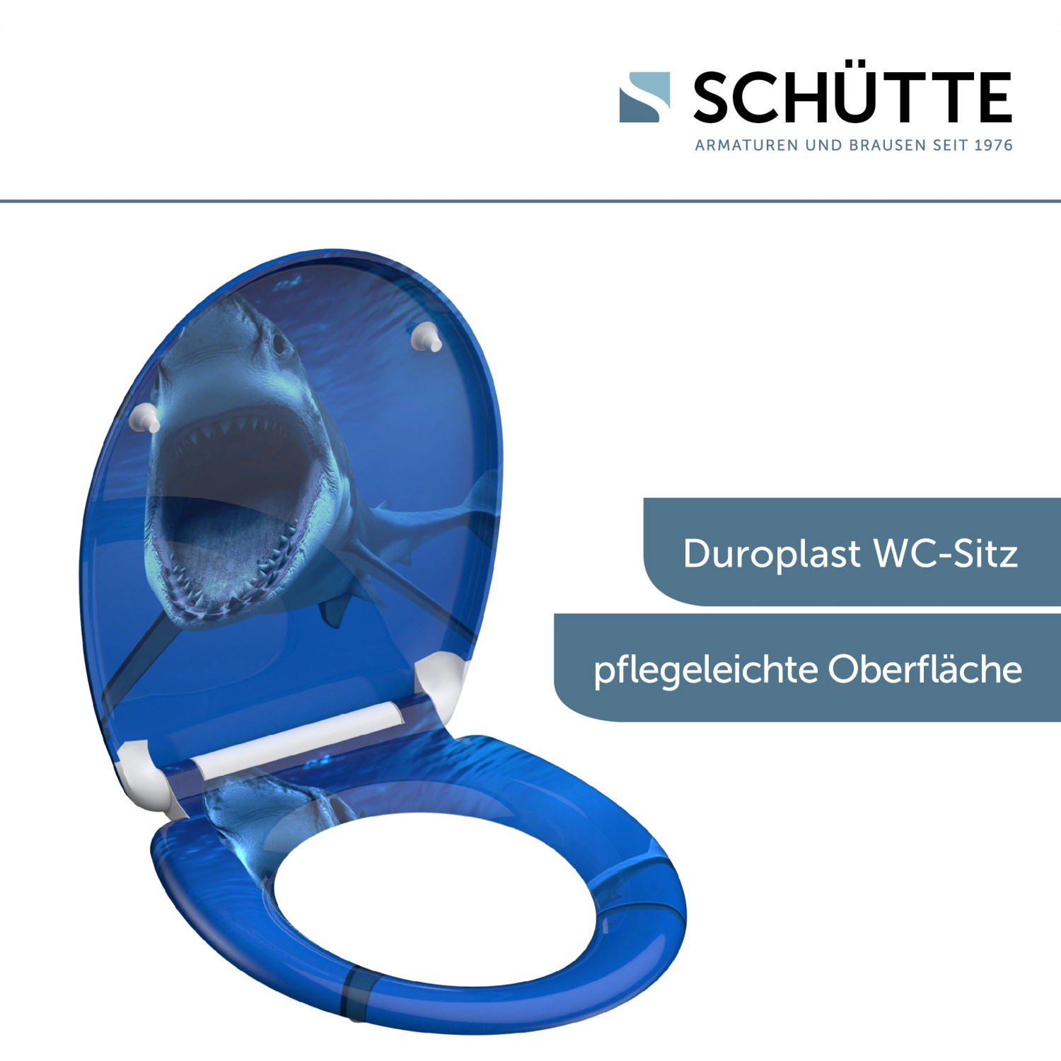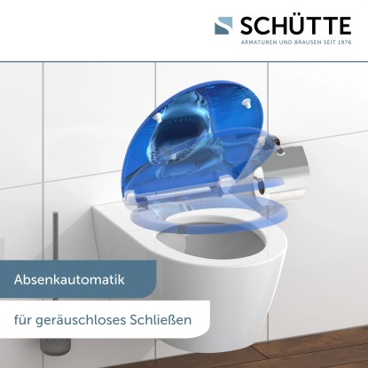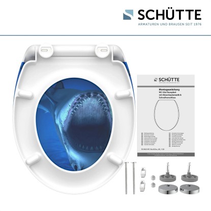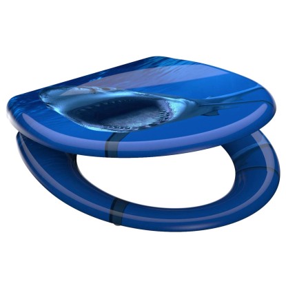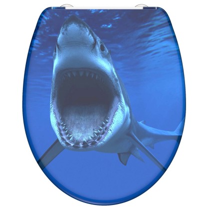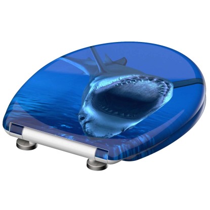 SHARK duroplaszt WC-ülőke. Ötletes formaterv egészen a legutolsó részletig.. Az az elképzelés, amely szerint a fürdőszoba kizárólag a napi higiéniát szolgálja, már rég a múlté.. Az olyan alapértékek, mint a sokszínűség és a termékek minősége, valamint az egyediség új távlatokat nyitnak.. . A termék jellemzői. . Egyedi: tetszetős SHARK nyomott minta. Kényelem és funkcionalitás: Kiváló minőségű WC-ülőke leeresztő automatikával (a fedél és az ülőke lágyan és hangtalanul csukódik le). Praktikus kezelés: a gyorszáras technológiának köszönhetően a WC-ülőke egyszerűen levehető. A WC-ülőke normál méretű, így szinte minden szokványos WC-csészéhez illik. Rugalmasság: állítható rögzítési technológia a különböző módokon történő felszereléshez. Innovatív rögzítési technológia: a ragasztólapos plusz rögzítésnek köszönhetően nem csúszik el a WC-ülőke. Hosszú élettartam: a rendkívül kemény felületű duroplaszt különösen törésbiztos és karcálló. Könnyen ápolható: a duroplaszt WC-ülőkék zárt pórusú felülete egyszerű és higiénikus tisztítást tesz lehetővé. A teljes szerelőkészletnek, valamint a könnyen érhető szerelési útmutatónak köszönhetően gyerekjáték a felszerelés. . Műszaki adatok:. . Mérete (Sz x Ma x Mé): 374 x 450 x 40 mm. A termék súlya: kb. 1657 g. Színe: nyomott minta három felületen. . Minőség-ellenőrzés:. a szigorú minőség-ellenőrzések és a kiváló minőségű anyagok nagy fokú biztonságról és tökéletes minőségről gondoskodnak.