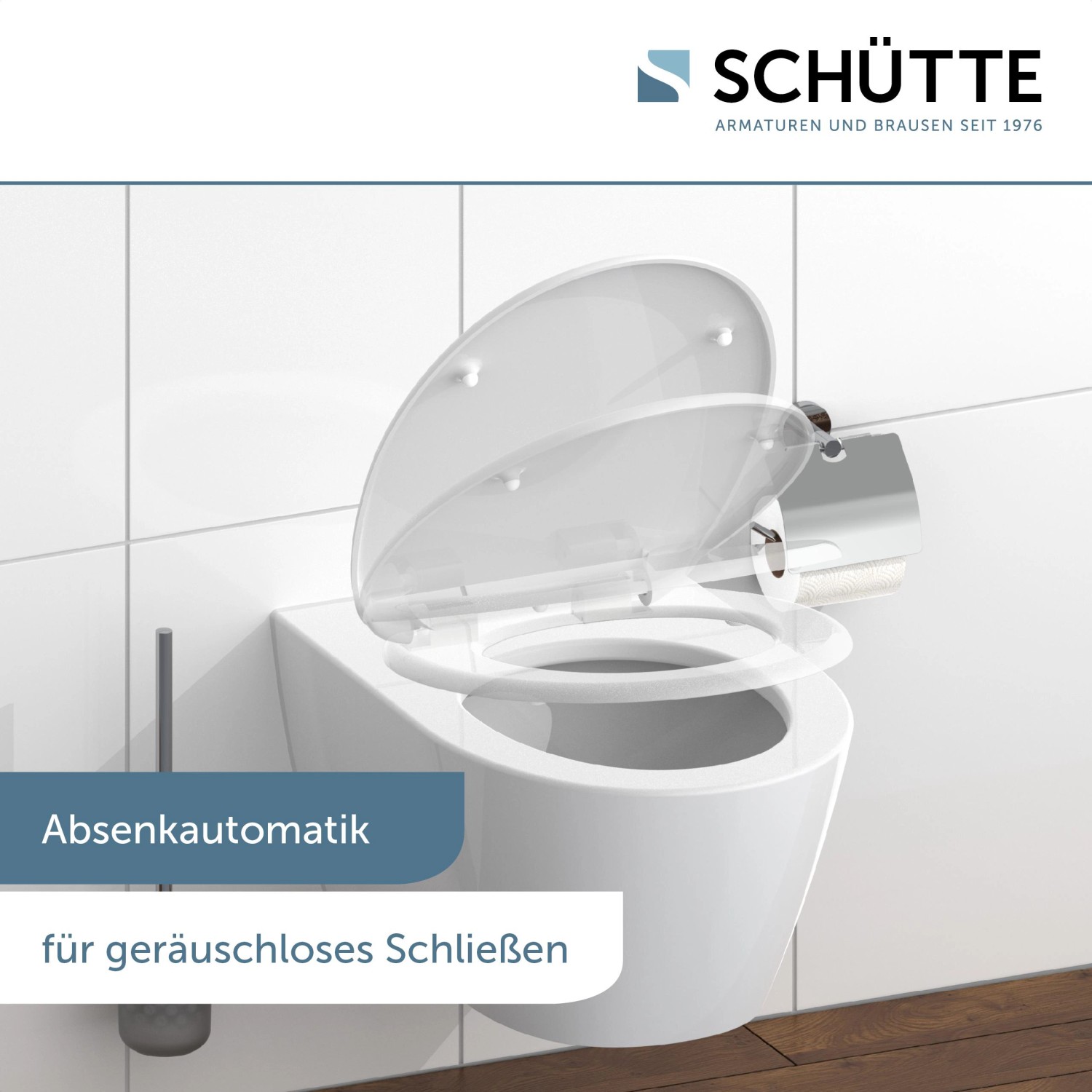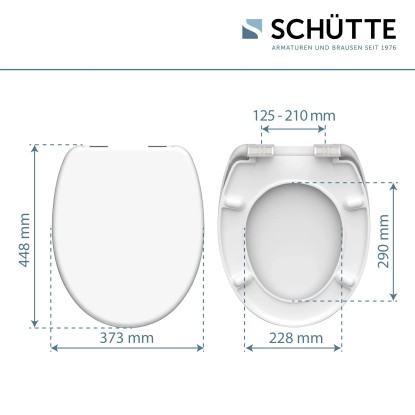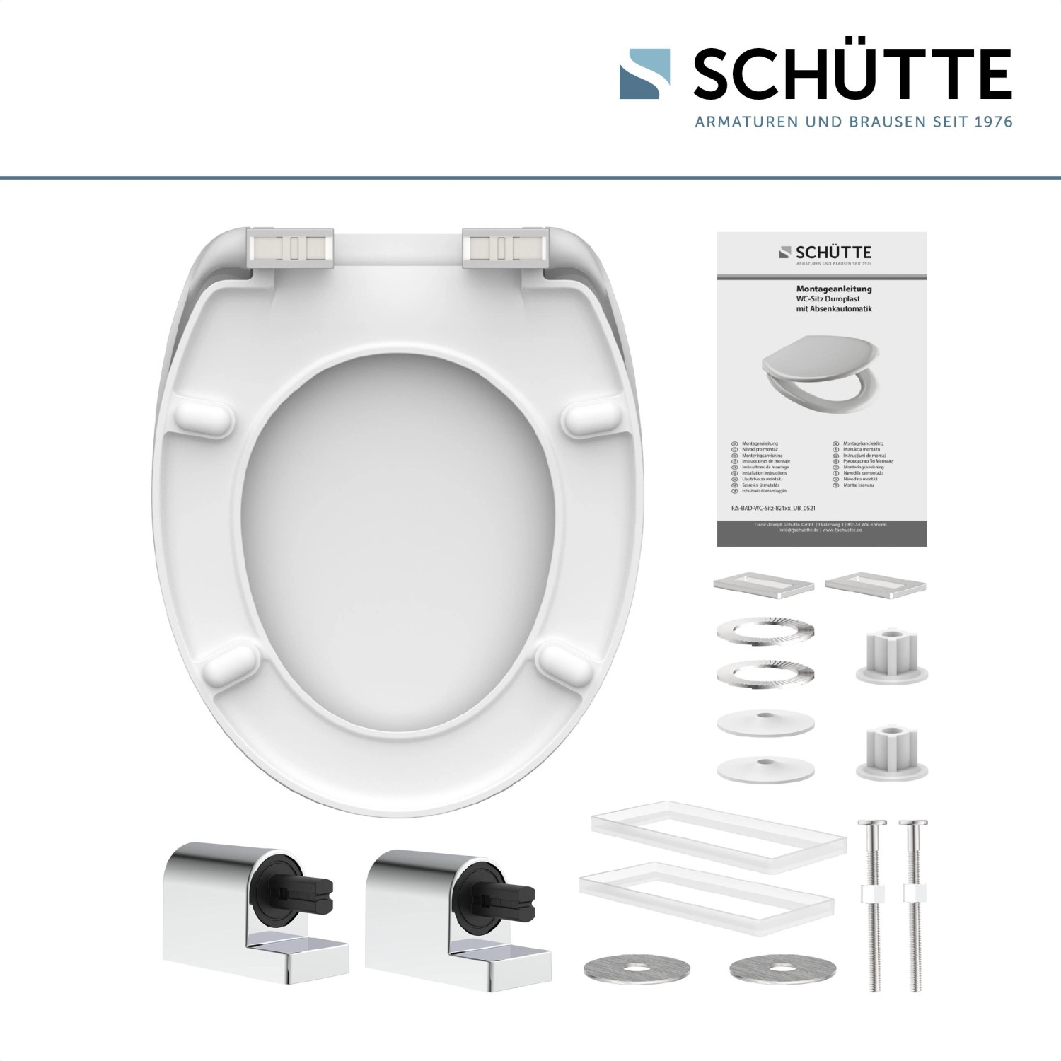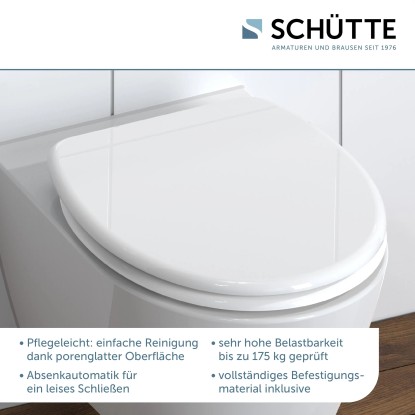 A leeresztő automatikával (fedél és ülés finoman és csendesen záródik) ellátott kiváló minőségű Schütte Duroplast WC-ülőke normál méretű, és szinte az összes kereskedelemben kapható WC-csészéhez alkalmas. A rendkívül kemény felületű Duroplast anyagnak köszönhetően a WC-ülőke különösem törésbiztos és karcálló. A zárt pórusú felület egyszerű és higiénikus tisztítást tesz lehetővé. A WC-ülőke rögzítése stabil csuklópántokkal történik. A Schütte Duroplast WC-ülőkét gyerekjáték felszerelni, és szerelésre kész állapotban, szerelési anyagokkal együtt kerül kiszállításra. Állítható rögzítési technológiával rendelkezik, amely rugalmas felszerelést tesz lehetővé.