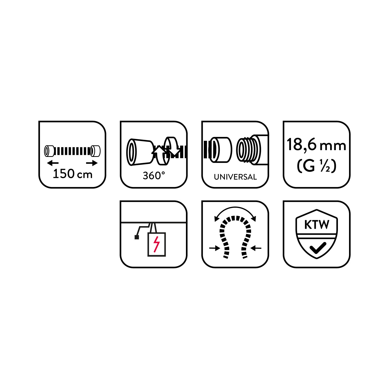 Mivel te is olyan fürdőszobát szeretnél, amely tartós, ezért minden alkatrész krómozott nemesacélból készült. A felhasznált anyagok kiváló minősége teszi robusztussá és tartóssá a zuhanycsövet. Ráadásul a zuhanycső 360°-os csavarodásgátlóval rendelkezik, így mindig lazán és egyenesen lóg. Nem törik meg és ellenáll a forró víznek. A rozsdamentes acélból készült zuhanycső 150 cm hosszú, így korlátozások nélkül ápolhatod magad tetőtől talpig. G 1/2 méretű, 18,6 mm átmérőjű univerzális csatlakozókkal felszerelt. Így minden szabványos zuhanyfej csatlakoztatható rá. A felszereléshez nincs szükséged szerszámra, mert a karmantyúkat kézzel is meg lehet húzni. Így a beszerelés gyorsan elvégezhető, te pedig azonnal élvezheted a zuhanyzást. Ezenkívül a zuhanycső megfelel az ivóvízvezetékekre vonatkozó érvényes szabványnak. Mellékeljük hozzá a tömítőanyagokat is, hogy azonnal elkezdhesd a beszerelést.