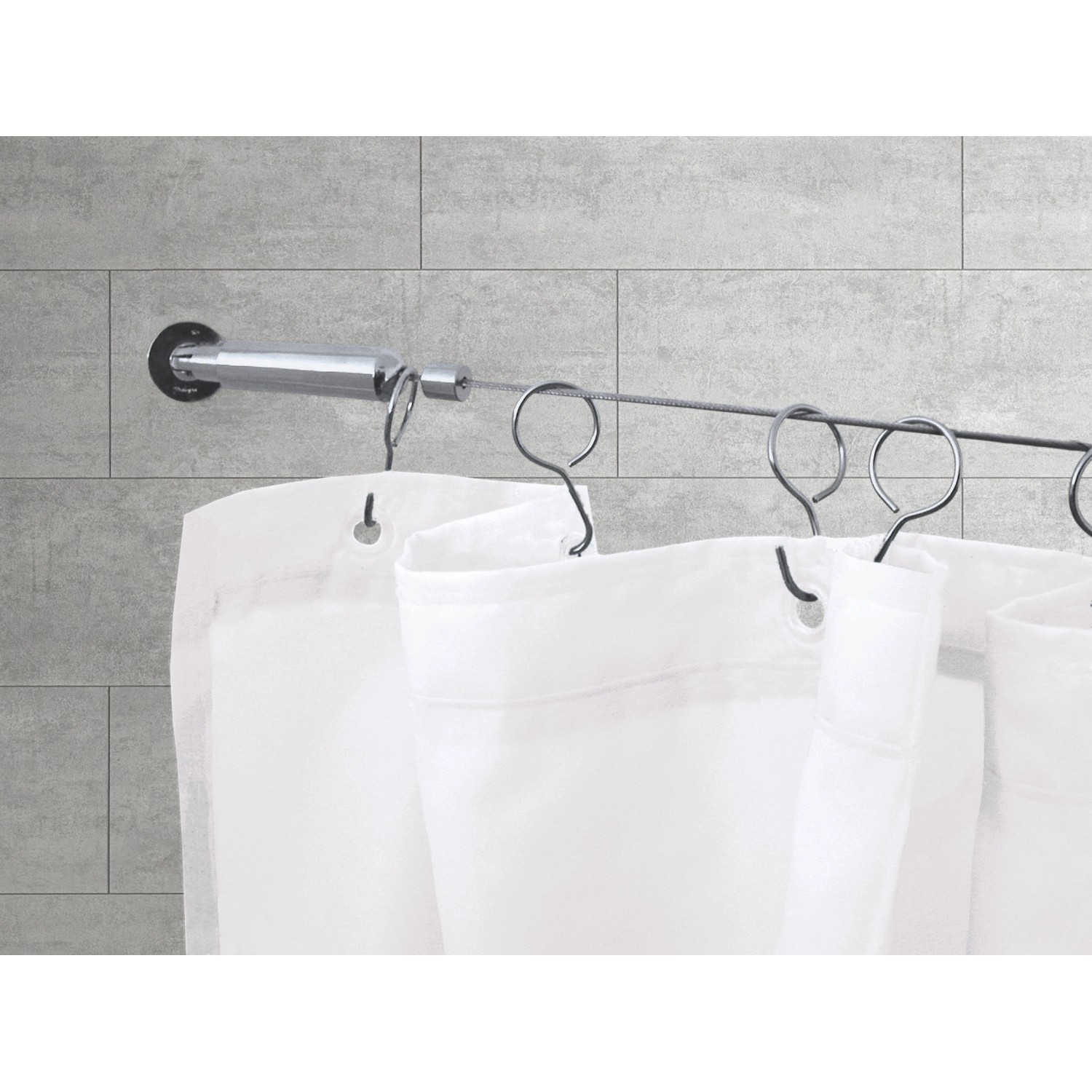 A kötelet nem kell derékszögben rögzíteni, a mellékelt csuklók segítségével a falra is rögzítheti. Így a függöny vonalát egyedileg a zuhanyzóhoz vagy fürdőkádhoz igazíthatja, akár 5 m hosszúságig. Ehhez csak a megfelelő kampókra van szüksége a kötélrendszerhez.