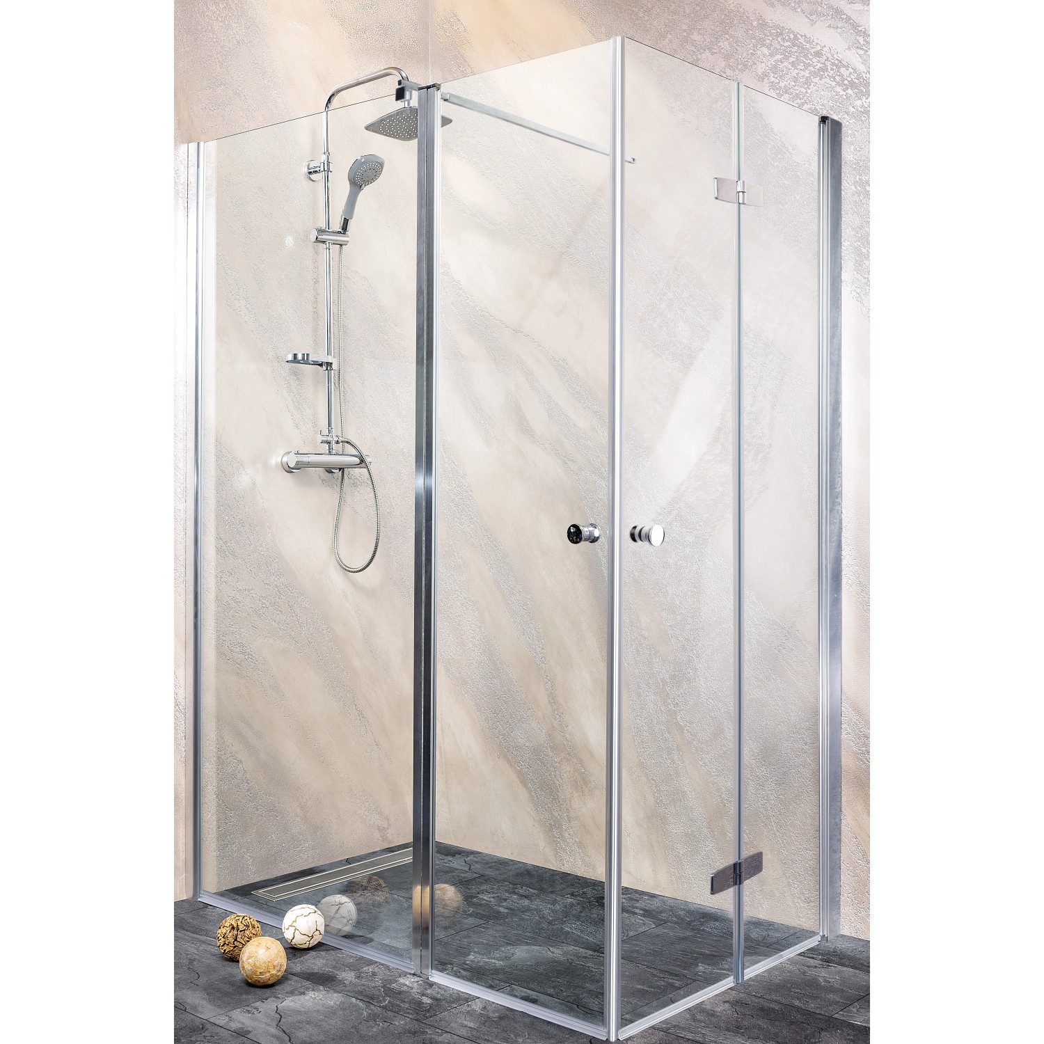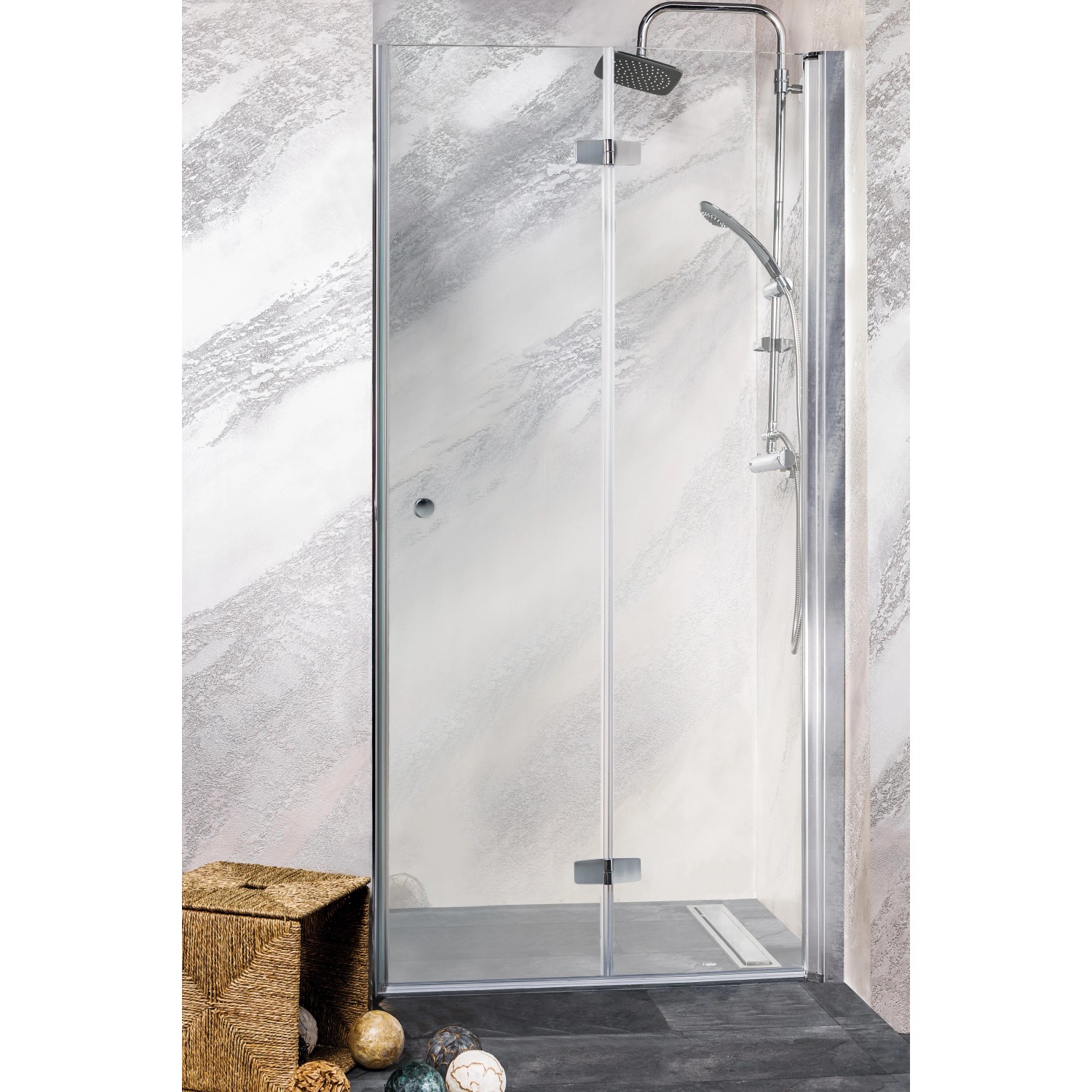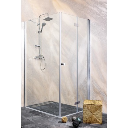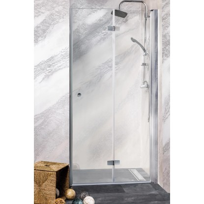 A középen csukló és 180 fokban nyitható ajtó lehetővé teszi a tér jöbb kihasználását kisebb fürdőszobákban is. 6 mm-es biztonsági üveg. Vízlepergető bevonat. Akadálymentes belépés. Állítható fali profil, króm. Vízzáró szilikon tömítés. Ajtóemelő mechanika