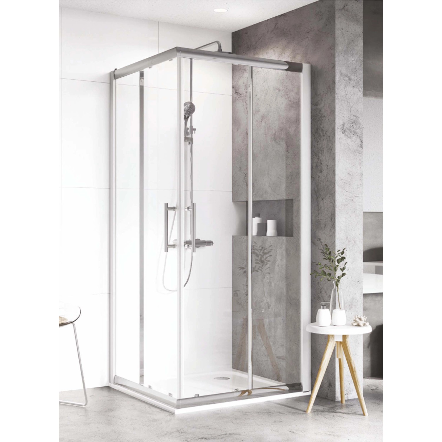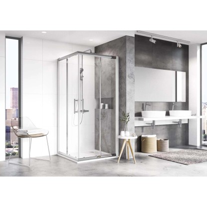 A RAVAK négyrészes, elcsúsztatható, sarokbelépős, krómhatású, transparent edzett biztonsági üveg betétlemezes zuhanykabin.