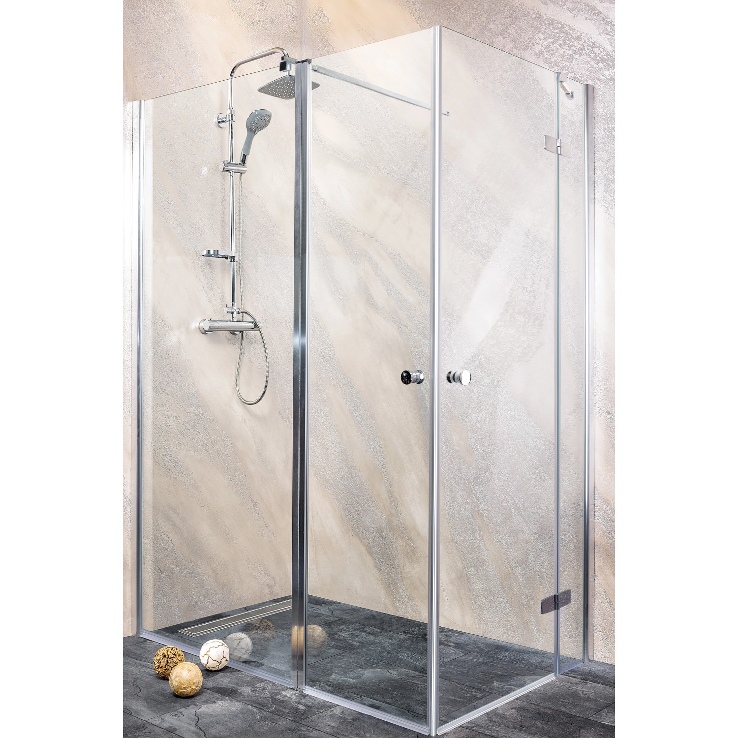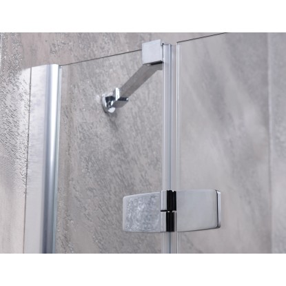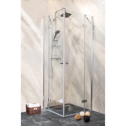 Osztott nyílóajtó a hagyományosabb formák kedvelőinek - kompromisszumok nélkül! 6 mm-es biztonsági üveg. Vízlepergető bevonat. Akadálymentes belépés. Távtartó, króm. Állítható fali profil, króm. Vízzáró szilikon tömítés. Ajtóemelő mechanika. Ajtóélzáró mágnescsík. Króm fogantyú. Jobbos kivitel.