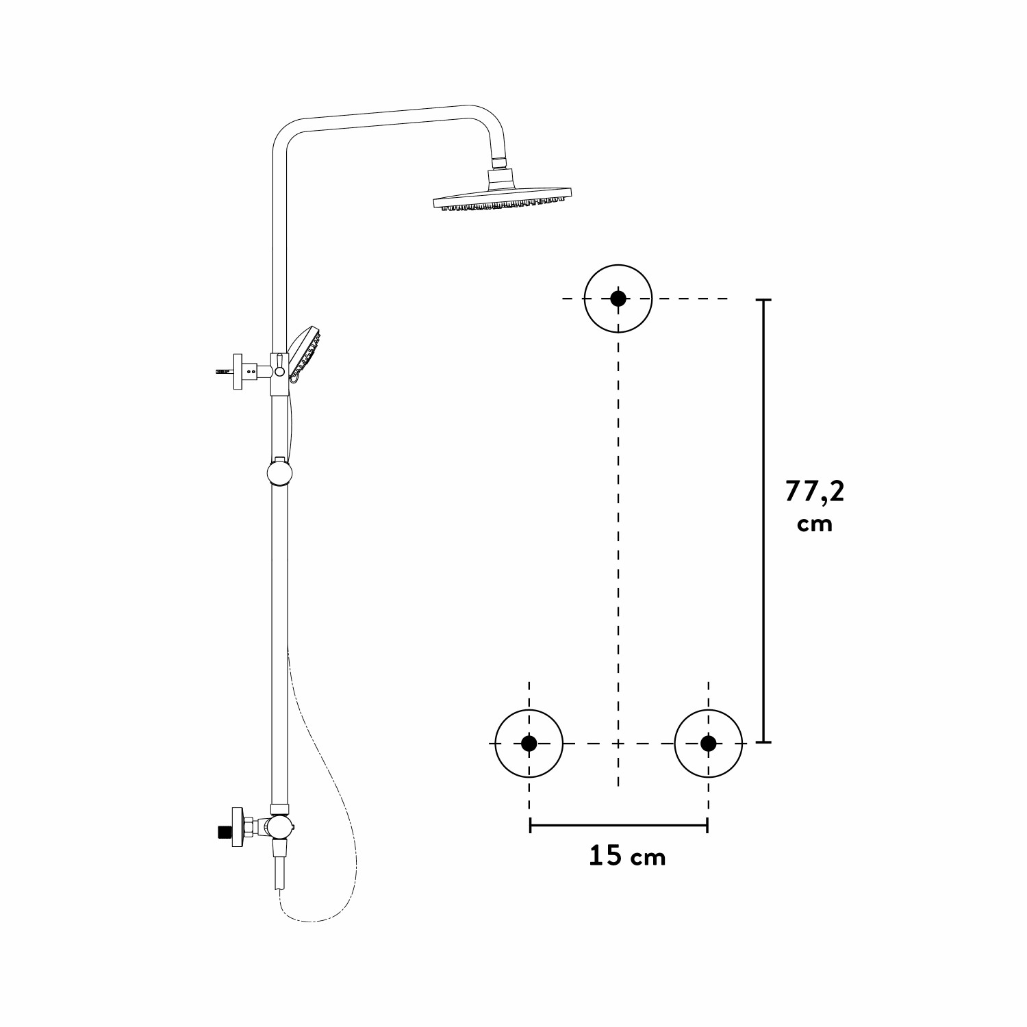 A felhasznált anyagok kiváló minőségének köszönhetően a fej feletti zuhanykészlet strapabíró és hosszú élettartamú. Mivel hosszú élettartamú fürdőszobát szeretnél, az összes darab fémből készült. A kézi zuhanyfej három sugárfajtája egyedi élménnyé teszi a zuhanyzást. Állítsd be a vízsugarat teljesen a saját ízlésed szerint. A pihentető wellness zuhanyzás érdekében a fej feletti zuhany nagy, 23 cm átmérőjű. A kézi zuhanyfej és a fej feletti zuhany vízkőgátló fúvókákkal rendelkezik, hogy ne képződhessenek rajtuk vízkőlerakódások. A 150 cm hosszú zuhanytömlő gondoskodik arról, hogy tetőtől talpig lemoshasd magad. A rögzítés megkönnyítése érdekében a zuhanytömlő szabványos, 18,6 mm-es (G1/2) csatlakozóval rendelkezik. A zuhany csaptelep 26,4 mm (G3/4) x 21 mm (G1/2) méretű S-csatlakozókkal rendelkezik. A 83 cm és 122 cm között kihúzható függőleges rögzítőcső a falra szerelhető. A rögzítőanyagot is mellékeljük, hogy azonnal hozzáfoghass a szereléshez.