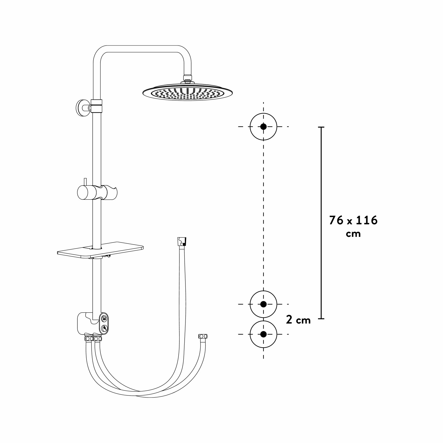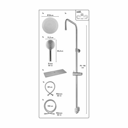 És mivel hosszú élettartamú fürdőszobát szeretnél, az összes darab fémből készült. Az alkalmazott anyagok kiváló minősége strapabíróvá és hosszú élettartamúvá teszi a zuhanyrendszert. A három sugárfajtával rendelkező kézi zuhanyfejet gombnyomással állíthatod be saját ízlésed szerint, és személyre szabott zuhanyzást élvezhetsz. A stresszes nap utáni pihentető esőztető zuhanyzás érdekében a fej feletti zuhany nagy, 24 cm átmérőjű. A vízkőgátló fúvókáknak köszönhetően a kézi zuhanyfej és fej feletti zuhany védve van a csúnya vízkőlerakódásokkal szemben, és egyszerű tisztítást tesznek lehetővé. A bekötőcső hossza 60 cm. A 150 cm hosszú zuhanytömlőnek köszönhetően tetőtől talpig lemoshatod magad. A szabványos, 18,6 mm-es (G1/2) csatlakozóméretnek köszönhetően a bekötőcső egy pillanat alatt rögzíthető. A 75 cm és 116 cm között kihúzható függőleges rögzítőcső egyszerűen szerelhető fel a falra. A rögzítőanyagot is mellékeljük, hogy azonnal hozzáfoghass a szereléshez.