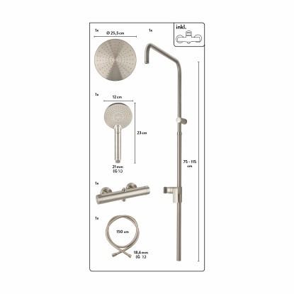 Az összes alkatrész fémből készült, így mind a zuhanyfej, mind az esőztető fej strapabíró és hosszú élettartamú. Mivel hosszú élettartamú fürdőszobát szeretnél! Az egy sugárfajtával rendelkező kézi zuhanyfej jól használható ahhoz, hogy leöblítsd magadat vagy megmosd a hajadat. 25,5 cm-es átmérőjével az esőztető fej pihentető esőztető hatást kínál. A vízkőlerakódások megelőzése érdekében a kézi zuhanyfej és az esőztető fej vízkőgátló fúvókákkal rendelkezik. Ez azt is jelenti, hogy a tisztítás kevés munkával jár. A zuhanytömlő 150 cm hosszú, hogy minden testrészedet elérd - és rendkívül szabad mozgásról is gondoskodik. A zuhanytömlő szabványos, 18,6 mm-es (G1/2) csatlakozójával gyorsan és egyszerűen rögzíthető. A zuhany csaptelep 26,4 mm (G3/4) x 21 mm (G1/2) méretű S-csatlakozókkal rendelkezik. A függőleges rögzítőcső 75 cm-ről 115 cm-re húzható ki, és közvetlenül a falra rögzíthető. A rögzítőanyagot is mellékeljük, hogy azonnal hozzáfoghass a szereléshez.