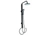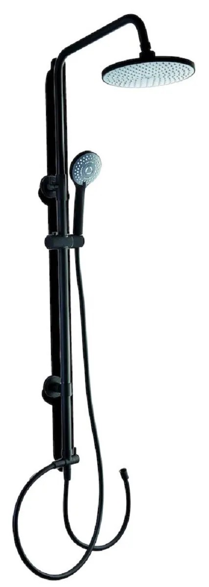 Krómozott, matt fekete színű fejfeletti zuhanyszett. A készlet tartalma: függőleges, 82 cm-től 120 cm-ig kihúzható zuhanyrúd, 150 cm-es gégecső rozsdamentes acélból, 22,5 cm átmérőjű fejzuhany, 3 funkciós kézi zuhanyfej. A csomag tartalmazza a rögzítőanyagokat
