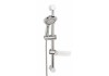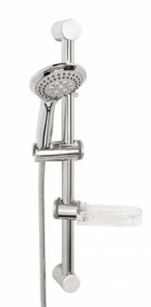 A készlet tartalma: 5 állású zuhanyfej, 600 mm-es csúsztatható zuhanyrúd, 150 cm-es fém tömlőt és egy műanyag szappantartót.